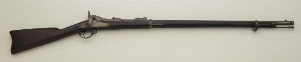 Early U.S. Springfield Model 1873 trapdoor rifle, .45-70 cal., 32-1/2” barrel, blue finish, high arch breech, early rear sight, full length wood stock, iron cleaning rod, sling swivels, #3929 in overall good to very good condition showing a plum brown patina, good bore, crisp action, good markings and overall good wood with scattered mars, dings and scratches from carry and storage; “CO” stamped into right side of butt stock, “17” stamped twice on top of stock’s comb at steel butt plate; small “c” stamped in stock behind lower tang; no other visible proofs or inspector markings; a very early ’73. From an old estate. Est.: $700-$1,400.