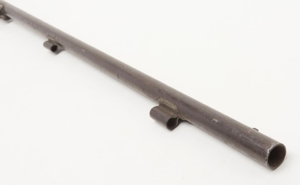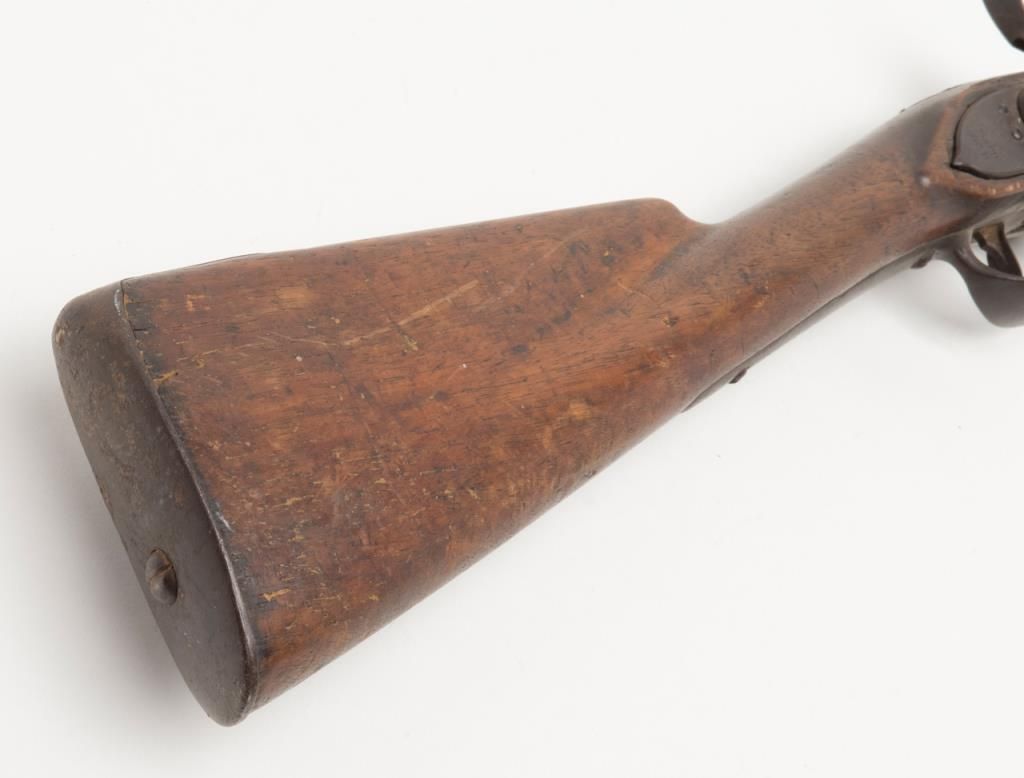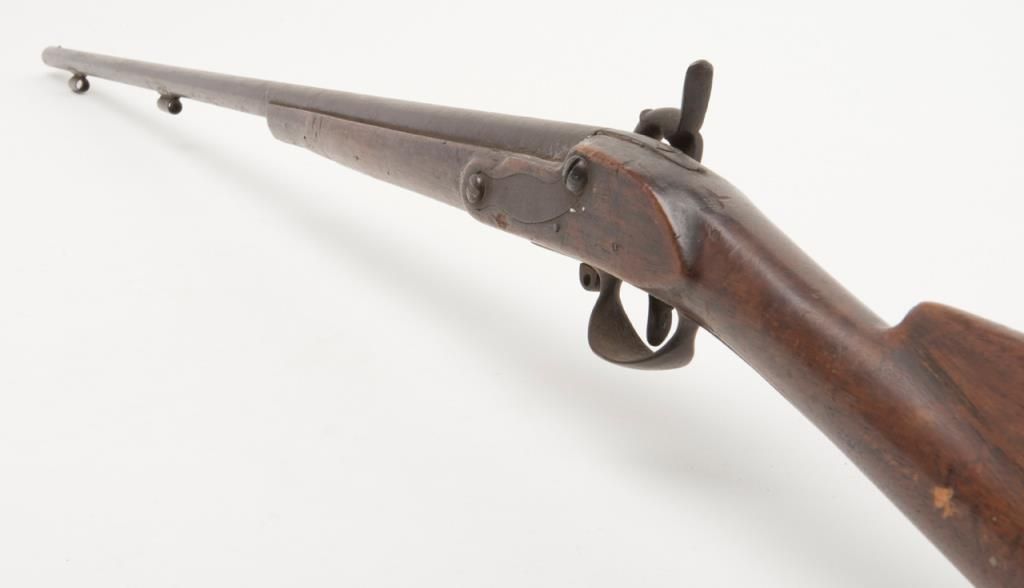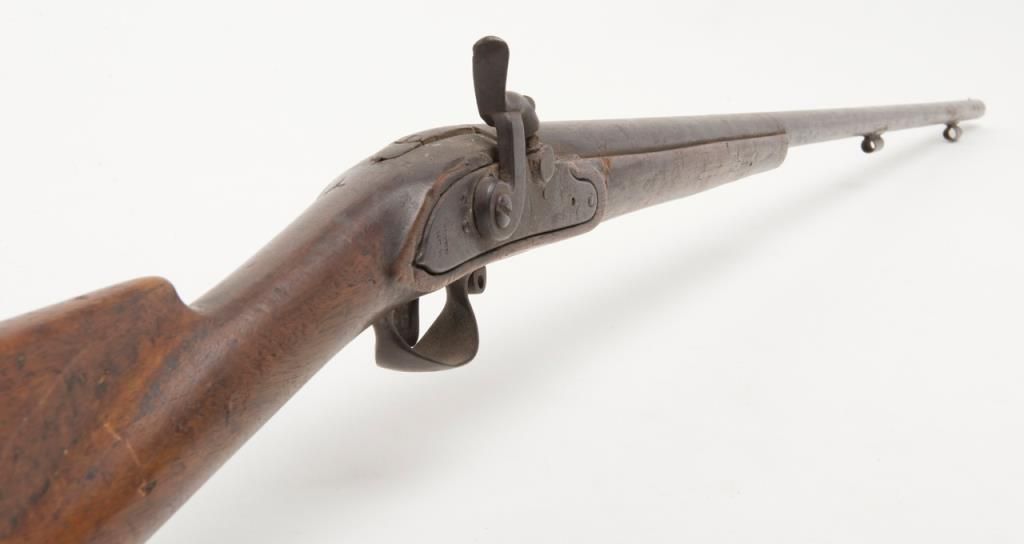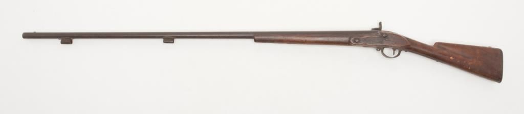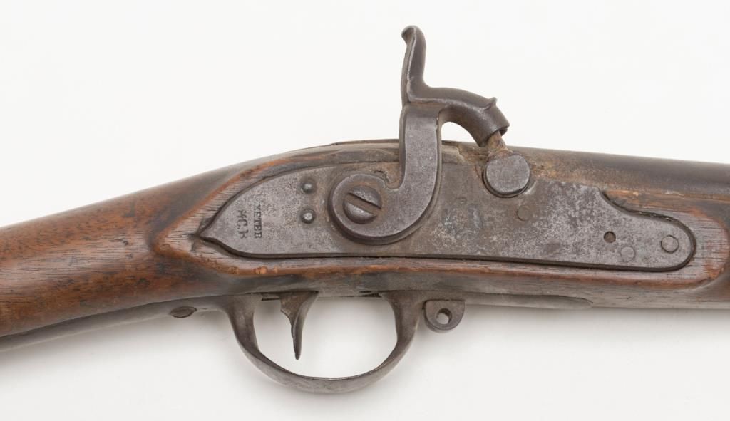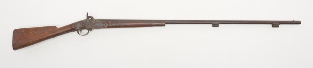 Early U.S. contract flintlock musket converted to percussion and reduced to half stock with swivels removed and brass thimbles added to barrel. Rear portion of the lock marked “Exeter” with traces of Eagle at the center portion of the lock. Themetal surfaces show a dark brown patina and light to moderate pitting and erosion. The stock is fair to good. The action is working. Just the type of musket that could’ve went West with pioneers and a good wall hanger. Est.: $250-$500