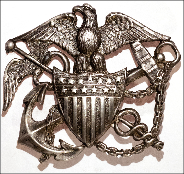 Established in 1852, Blackinton & CO Inc. in North Attleboro, MA is a private company, still in business today, categorized under the specialty of Badge Manufacturers. Their hallmark is located upon the reverse upper right wing of the Heraldic American Eagle device. This handsome, large size, Silver Navy Medical Badge measures about 2.25” wide x 2” tall. It is in excellent condition. The outstanding designs are highlighted by deeper silver-gray tones within the devices. There as a central large American Heraldic Eagle with crossed Medical Staff and Anchor below. This rare pinback badge has only slight actual wear and its original pin is fully intact. Undoubtedly rare. Perhap a custom made item for a ranking United States Naval medical officer, likely produced any time between the Civil War Era and the turn of the century? The very first we have seen and offered.