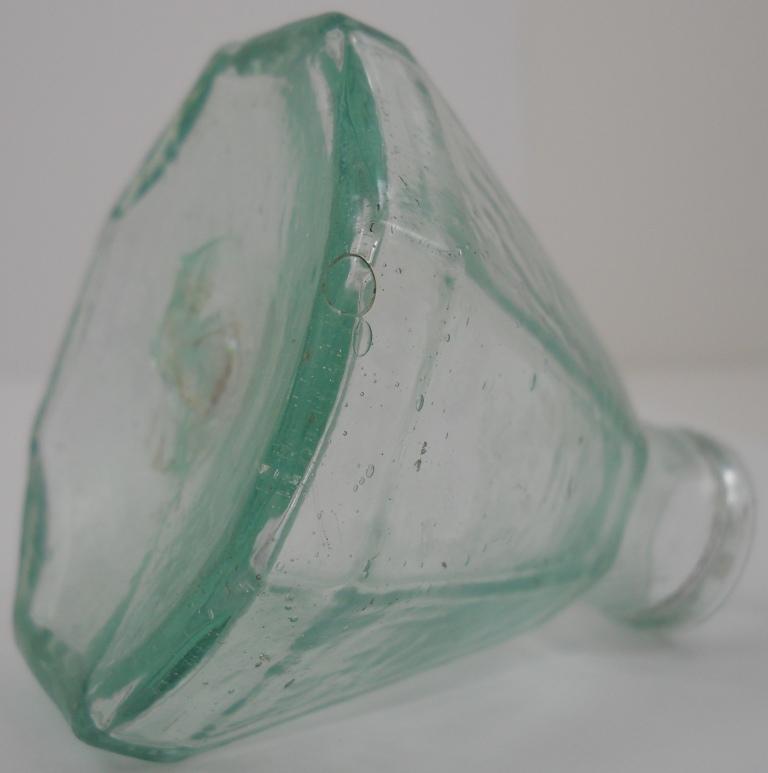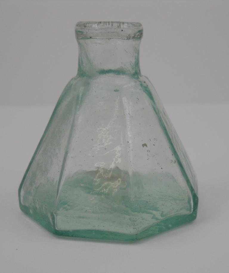 This is a very early umbrella glass, open-pontil, eight-sided aqua ink well that stands 2-3/8 inches tall and is 2-1/4 inches across the base.