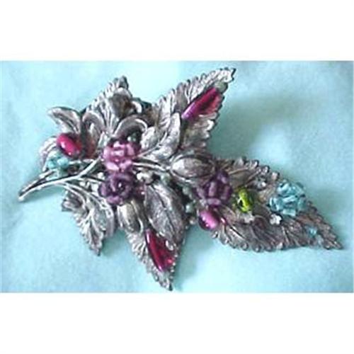 Silver metal multiple leaf pin with colorful glass bead accent from the Estate of Miriam Haskell. Slight green corrosion on the back plate.