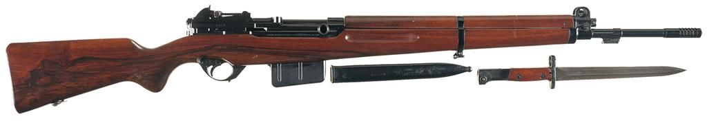 Manufactured between 1949 and 1956. Has a drift adjustable front sight stamped "6,7" and an elevation adjustable rear sight. The top of the receiver is marked with the Venezuelan coat of arms. The receiver, top cover, bolt and rear of the bolt carrier are stamped with the serial number "2935". The barrel is fitted with a flash hider. Mounted on a smooth walnut stock with finger grooves, sling swivels and a ribbed steel buttplate. With an unmarked bayonet and scabbard.