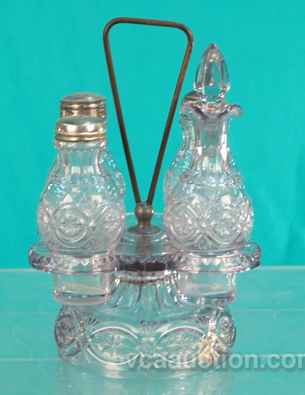 Early Victorian 4 Bottle Purple Glass Cruet Set - Britannic 1894 Mckee Glass Co. Pittsburgh, PA.