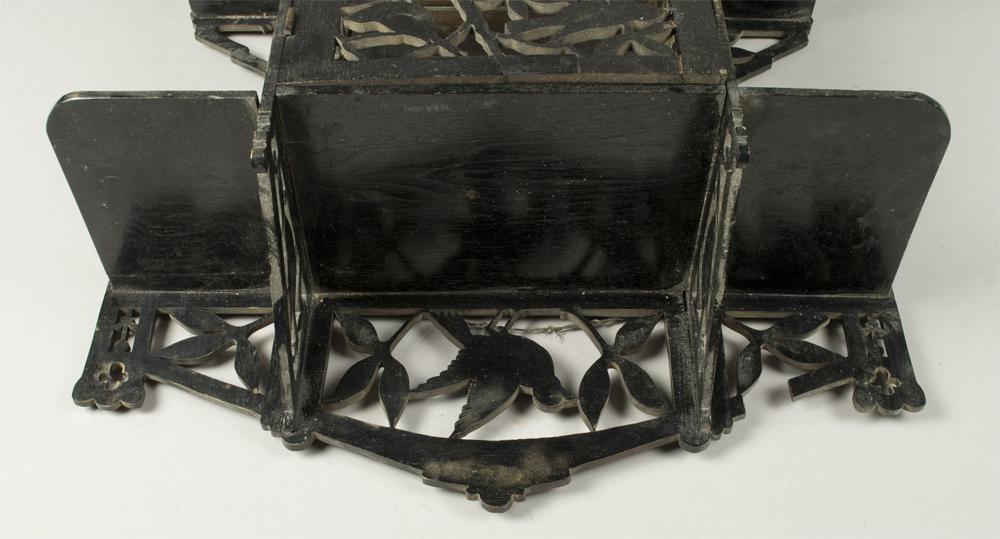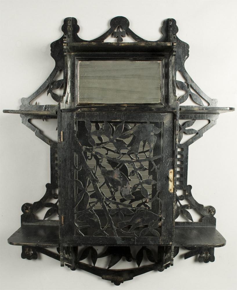 Top with small shelf above central single door opening to reveal mirror with small shelf above small shelf with mirror. All carved to depict birds, berries, flowers and leaves. 24" H x 19" W, several breaks to door, break to right bottom as well as a repair, and break to top right. Door sticks.
