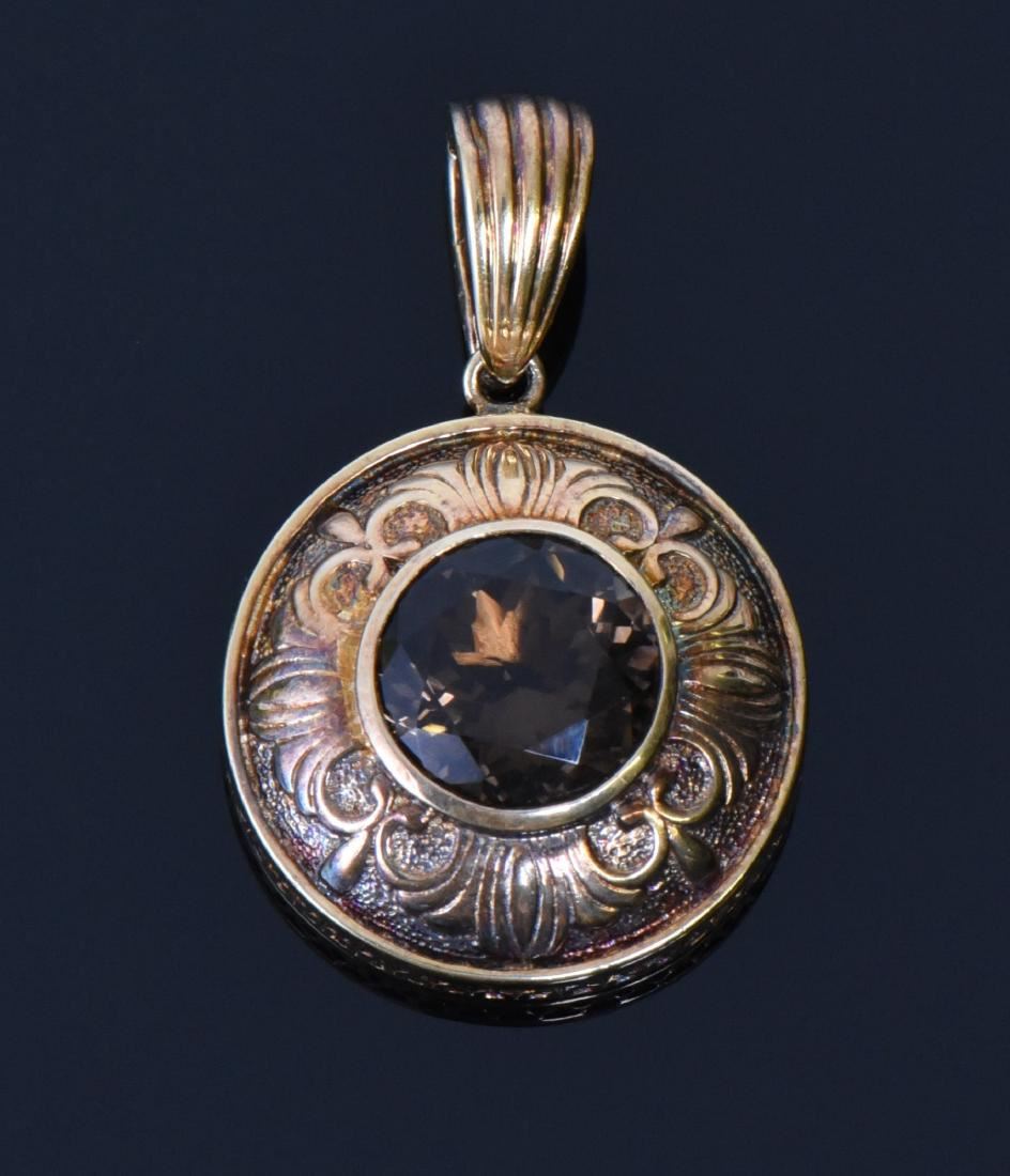 Early Victorian Smokey Quartz Circular Pendant Set in Gold Overlay On Sterling Silver With Open Floral Renaissance Design On The Reverse Side. Estimated more than 100 yrs old. European art encompasses the history of visual art. Artistic development within Europe becomes clear only with the art of Ancient Greece, adopted and transformed by Rome and carried; with the Empire, across much of Europe, North Africa and the Middle East. The influence of the art of the Classical period continued over two thousand years, seeming to slip into a distant memory in parts of the Medieval period, and to return in the Renaissance period, and then decay during the Baroque period, only to reappear in a refined form in Neo-Classicism and to be reborn in Post-Modernism. Before the 1800s, the Christian church was a major influence upon European art, the commissions of the Church, architectural, painterly and sculptural, providing the major source of work for artists. The history of the Church was very much reflected in the history of art, during this period. In the same period of time there was renewed interest in heroes and heroines, tales of mythological gods and goddesses, great wars, and bizarre creatures which were not connected to religion. Secularism has influenced European art since the Classical period, while most art of the last 200 years has been produced without reference to religion and often with no particular ideology at all. European art is arranged into a number of stylistic periods such as Classical, Byzantine, Medieval, Gothic, Renaissance, Baroque, Rococo, Neoclassical, Modern and Postmodern. (Wikipedia) Size: See Ruler Photo. (Photos Represent The Condition Of The Lot.)