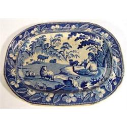 Early Victorian blue and white transfer printed rectangular pottery plate, decorated with a sheph…