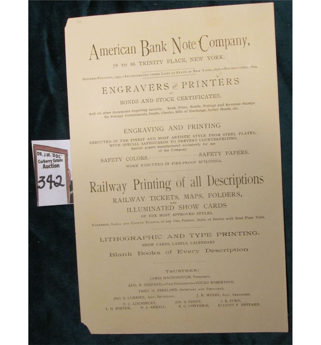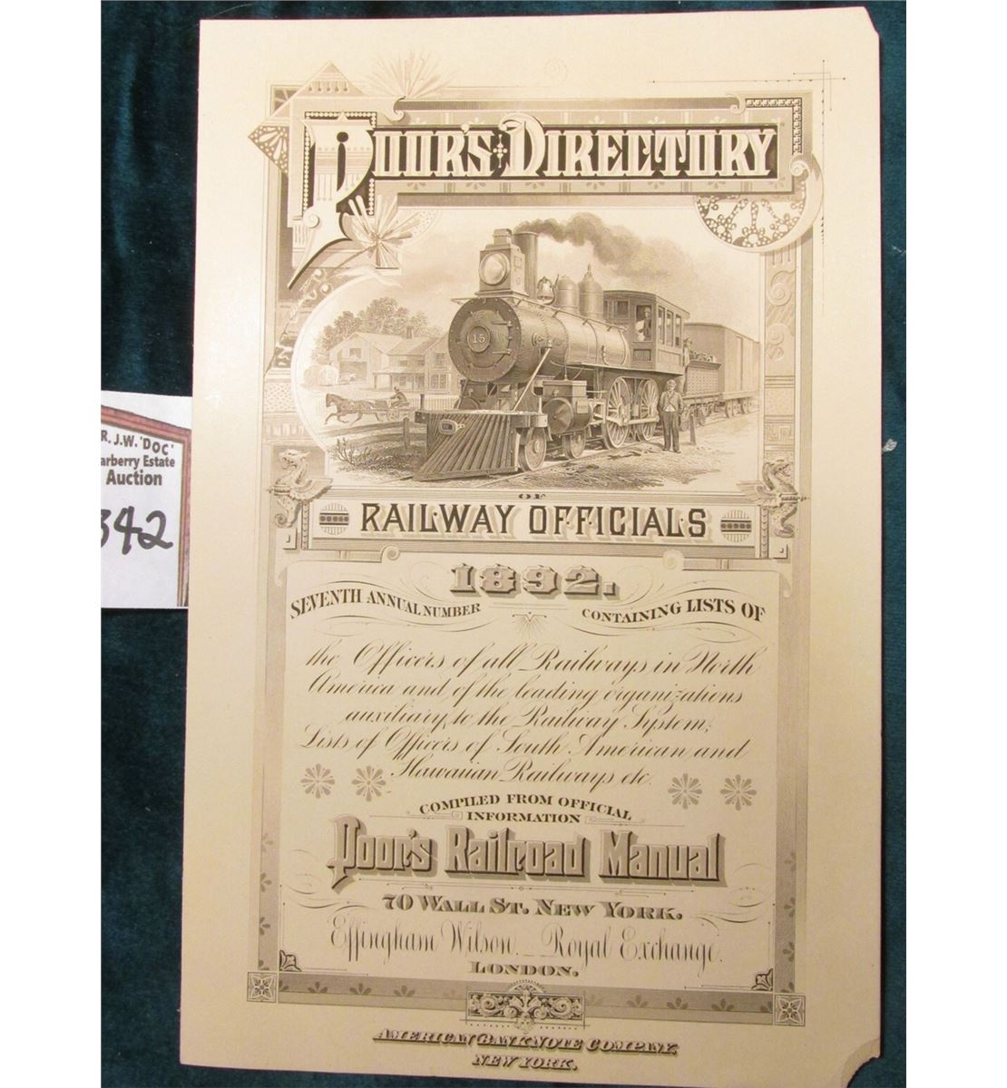 Early Vignette Advertising sheet "Poor's Directory Railway Officials 1892…Poor's Railroad Manual…70 Wall St. New York.". RL corner missing. Vignette of Train and advertising by American Bank Note Company, New York. 5 1/2" x 8 3/4". 'Doc' value at $150.00.