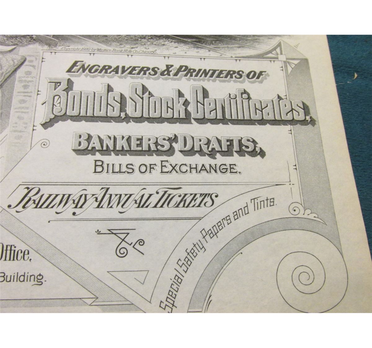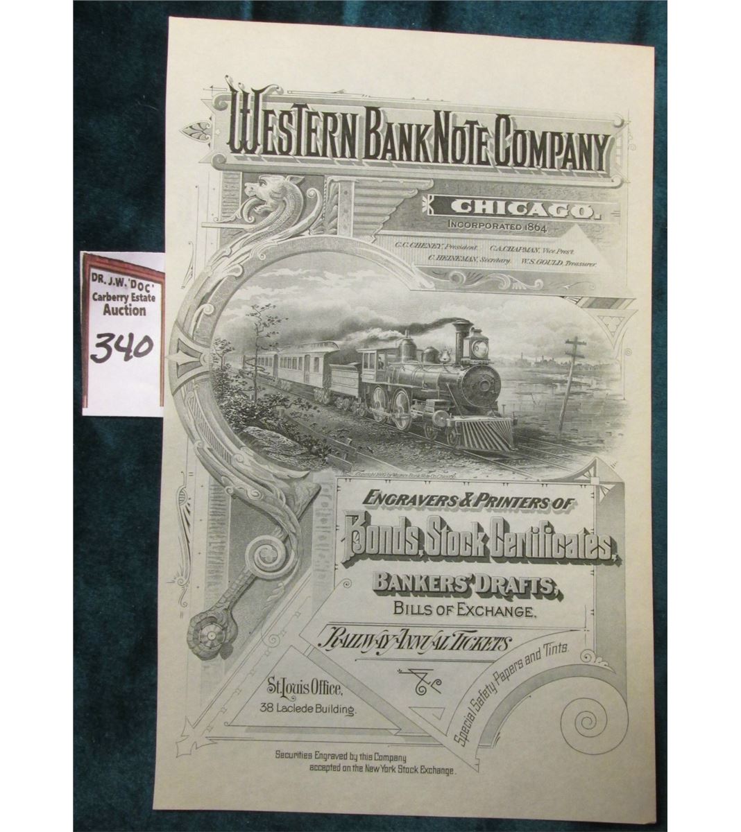 Early Vignette Advertising sheet "Western Bank Note Company Chicago Incorporated 1864…Engravers & Printers of Bonds, Stock Certificates Bankers' Drafts,…". 5 3/8" x 8 5/8". 'Doc' value at $135.00.