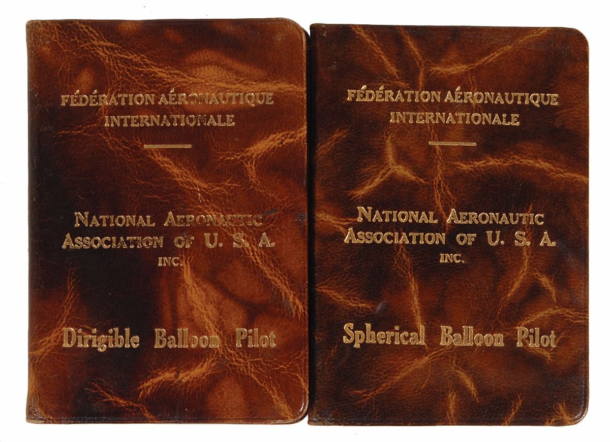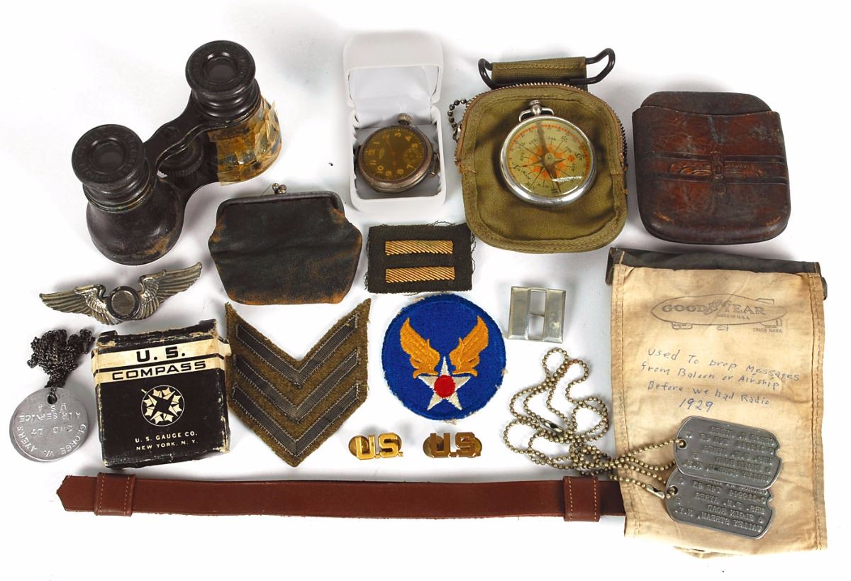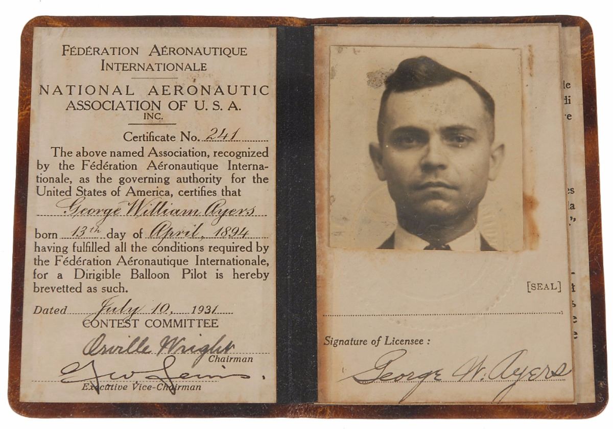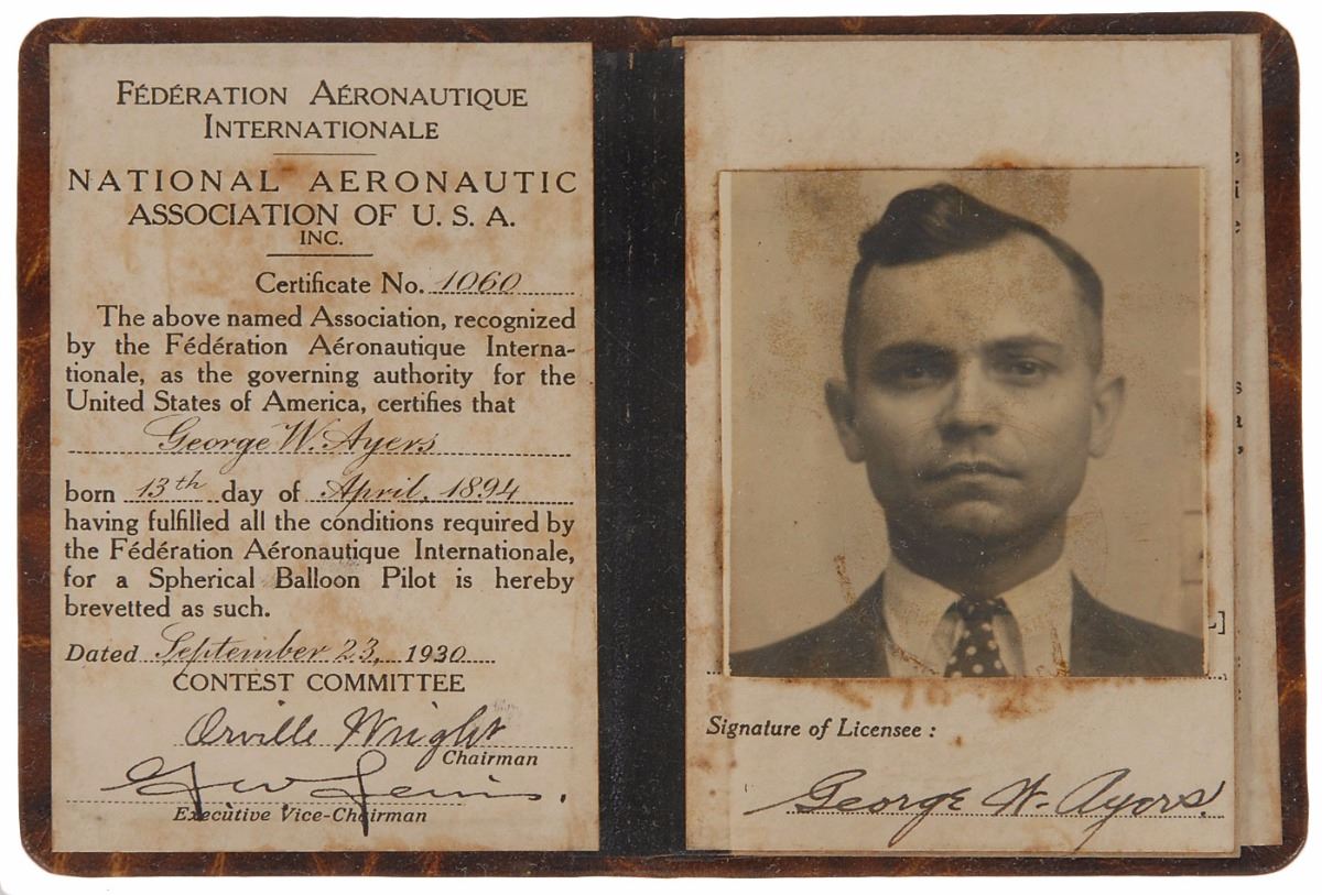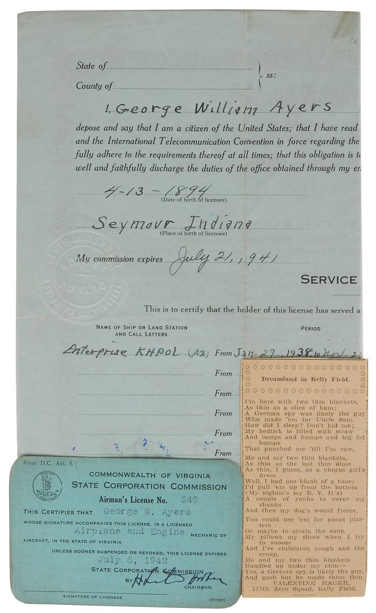 Comprehensive archive from the career of early American aviator George W. Ayers, whose flying career began in World War I and continued through World War II, consisting of a wide variety of material including his papers, equipment, photographs, and other memorabilia. Particularly notable are two leatherbound licenses from the Federation Aeronautique Internationale/National Aeronautic Association of USA certifying Ayers as a “Spherical Balloon Pilot” and “Dirigible Balloon Pilot,” dated 1930 and 1931, each signed inside by Orville Wright. Two large binders consist primarily of his military records and papers, dating from 1918 through 1945, including hundreds of pages of military orders, memos, and records; among the most interesting items here are materials from New Guinea during WWII, including maps, an “Instructions to Air Crews” booklet detailing how to deal with native populations, and a crude soldier-produced newsletter from November 22, 1942, entitled “The Gili Gili.” Also included are eleven photographs from this period, including photos from the 1920s showing the Air Service Officers Reserve Corps and airfields, as well as an early photo of two Goodyear blimps; six oversized photos are also present, including a two-foot-long panorama of a flying regiment and several others showing military aircraft. Numerous flight logs and diaries are included as well. Several elements of Ayers’s uniform are also in this collection, including two types of hats, canvas and leather gaiters, patches, cufflinks, aviator wings, and his dog tag. Some equipment is also included, such as binoculars, a WWI Ingersoll wristwatch, and bowls and silverware brought home from World War II. In overall very good condition. Boasting a wealth of unique and hard-to-find early aviation material, this is an utterly fascinating collection chronicling the life’s journey of a single aviator.