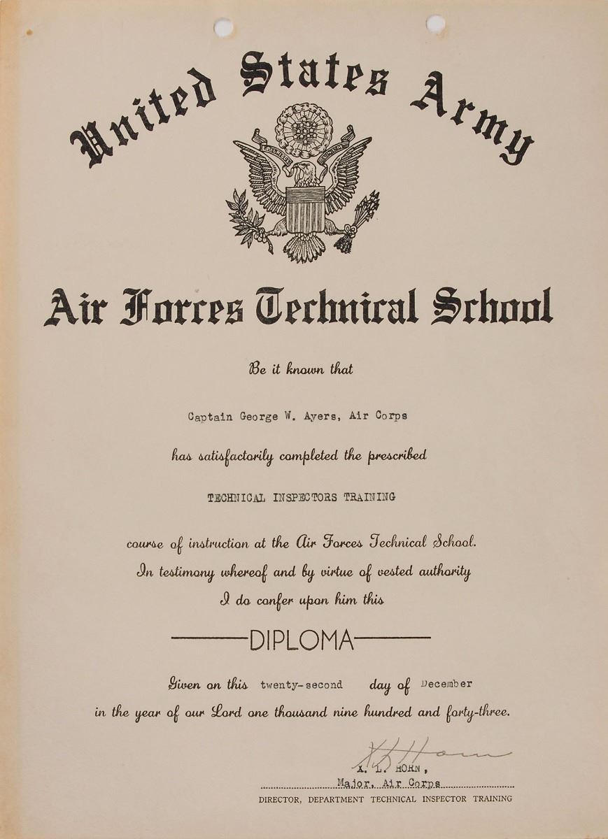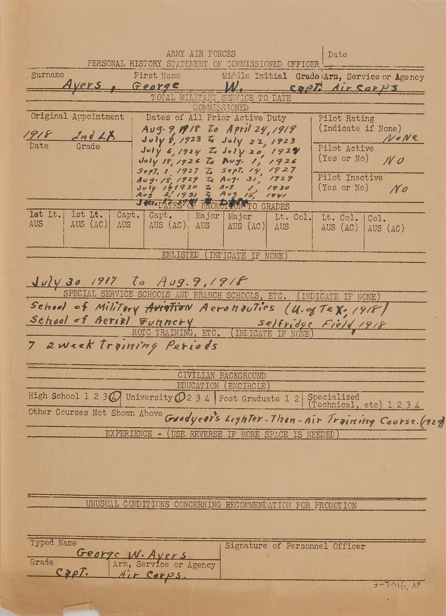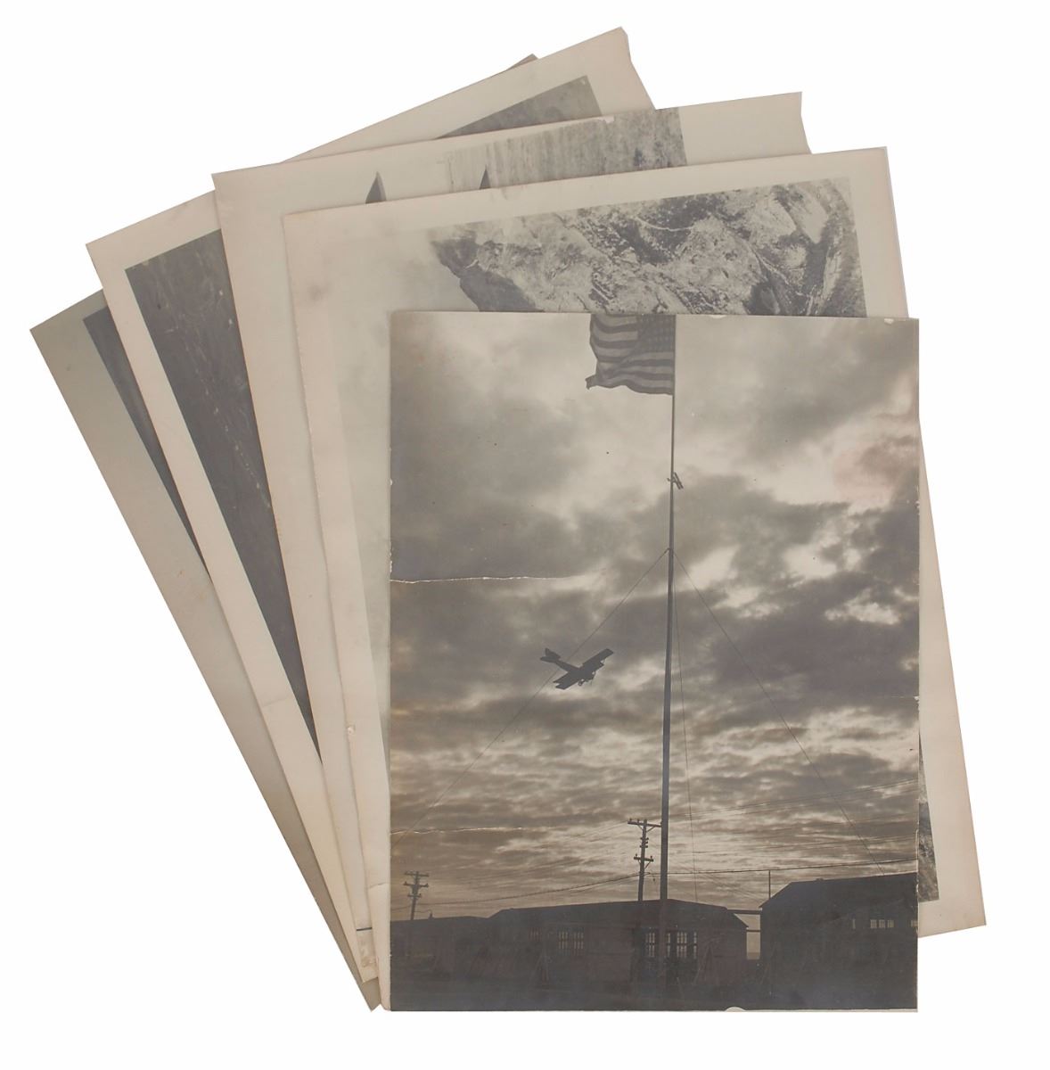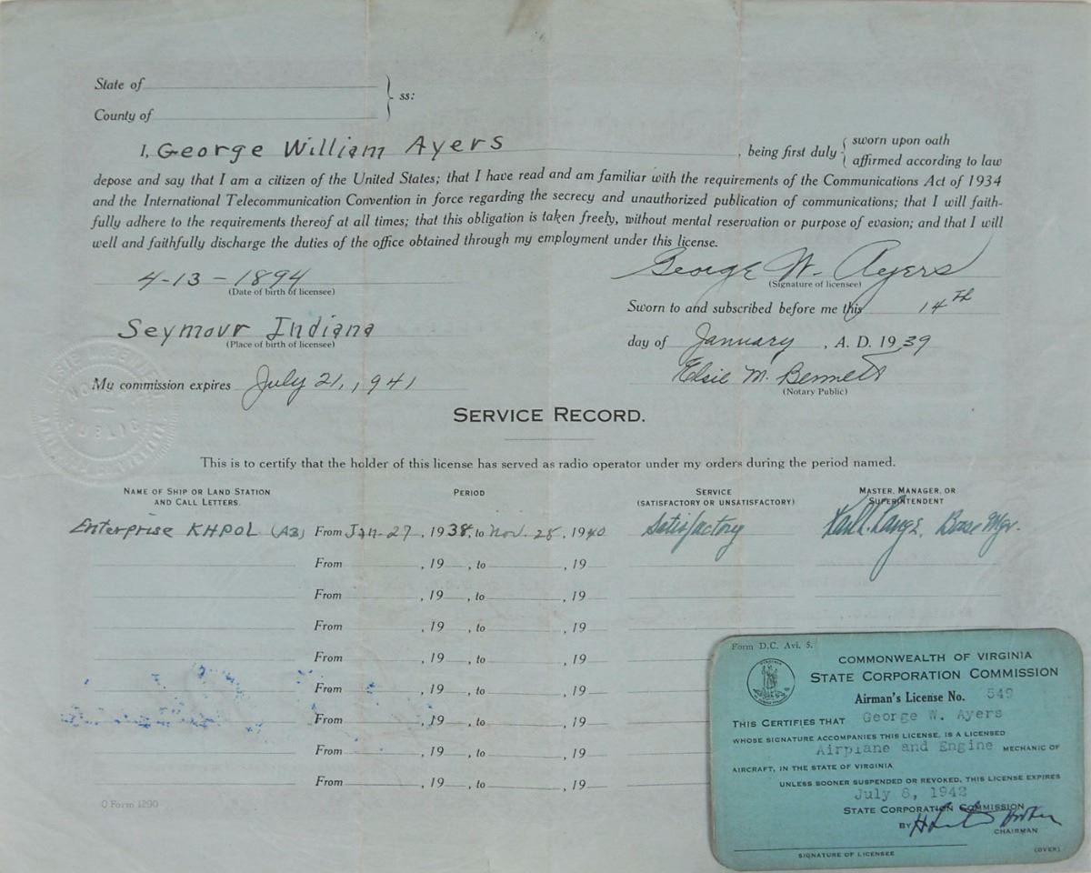 Comprehensive archive from the career of early American aviator George W. Ayers, whose flying career began in World War I and continued through World War II, consisting of a wide variety of material including his papers, equipment, photographs, and other memorabilia. Particularly notable are two leatherbound licenses from the Federation Aeronautique Internationale/National Aeronautic Association of USA certifying Ayers as a “Spherical Balloon Pilot” and “Dirigible Balloon Pilot,” dated 1930 and 1931, each signed inside by Orville Wright. Two large binders consist primarily of his military records and papers, dating from 1918 through 1945, including hundreds of pages of military orders, memos, and records; among the most interesting items here are materials from New Guinea during WWII, including maps, an “Instructions to Air Crews” booklet detailing how to deal with native populations, and a crude soldier-produced newsletter from November 22, 1942, entitled “The Gili Gili.” Also included are eleven photographs from this period, including photos from the 1920s showing the Air Service Officers Reserve Corps and airfields, as well as an early photo of two Goodyear blimps; six oversized photos are also present, including a two-foot-long panorama of a flying regiment and several others showing military aircraft. Numerous flight logs and diaries are included as well. Several elements of Ayers’s uniform are also in this collection, including two types of hats, canvas and leather gaiters, patches, cufflinks, aviator wings, and his dog tag. Some equipment is also included, such as binoculars, a WWI Ingersoll wristwatch, and bowls and silverware brought home from World War II. In overall very good condition. Boasting a wealth of unique and hard-to-find early aviation material, this is an utterly fascinating collection chronicling the life’s journey of a single aviator.