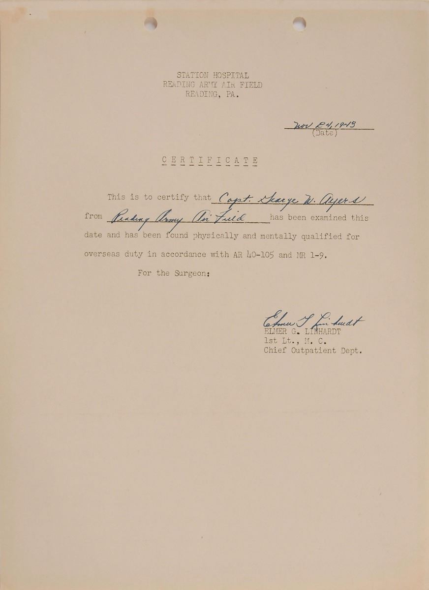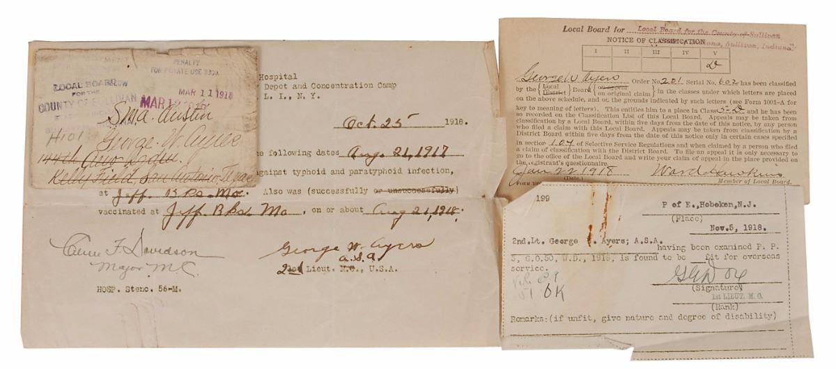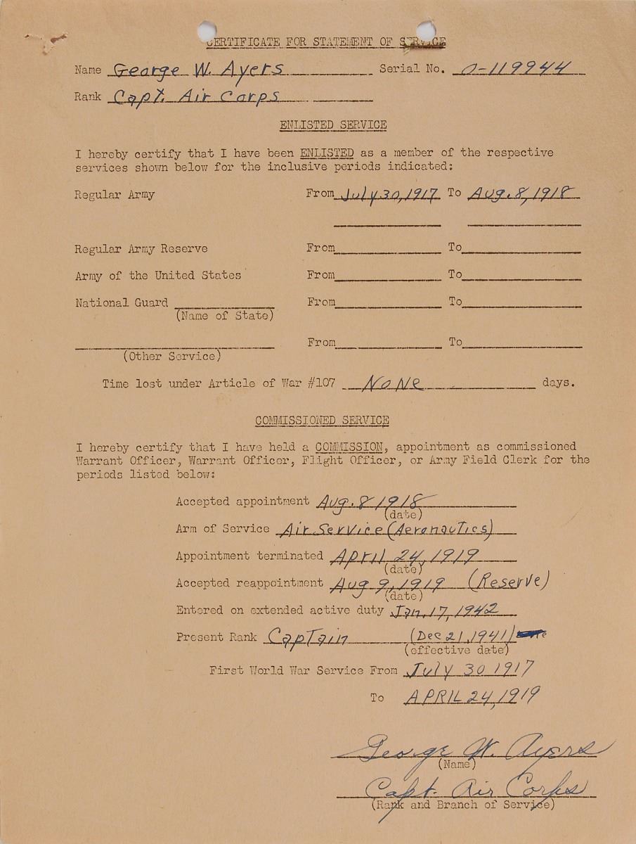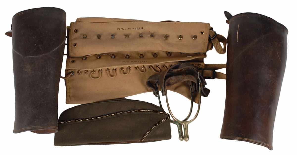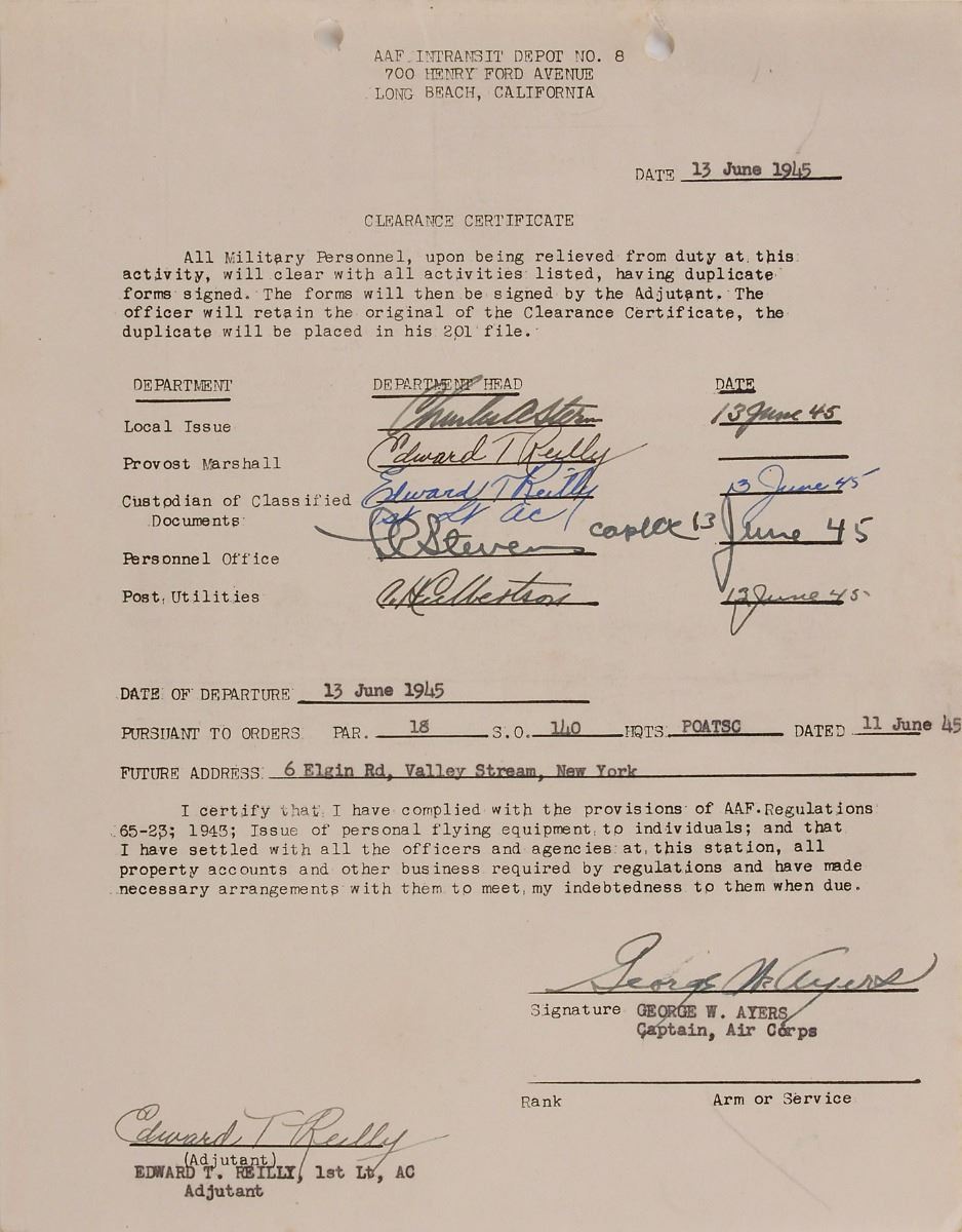 Comprehensive archive from the career of early American aviator George W. Ayers, whose flying career began in World War I and continued through World War II, consisting of a wide variety of material including his papers, equipment, photographs, and other memorabilia. Particularly notable are two leatherbound licenses from the Federation Aeronautique Internationale/National Aeronautic Association of USA certifying Ayers as a “Spherical Balloon Pilot” and “Dirigible Balloon Pilot,” dated 1930 and 1931, each signed inside by Orville Wright. Two large binders consist primarily of his military records and papers, dating from 1918 through 1945, including hundreds of pages of military orders, memos, and records; among the most interesting items here are materials from New Guinea during WWII, including maps, an “Instructions to Air Crews” booklet detailing how to deal with native populations, and a crude soldier-produced newsletter from November 22, 1942, entitled “The Gili Gili.” Also included are eleven photographs from this period, including photos from the 1920s showing the Air Service Officers Reserve Corps and airfields, as well as an early photo of two Goodyear blimps; six oversized photos are also present, including a two-foot-long panorama of a flying regiment and several others showing military aircraft. Numerous flight logs and diaries are included as well. Several elements of Ayers’s uniform are also in this collection, including two types of hats, canvas and leather gaiters, patches, cufflinks, aviator wings, and his dog tag. Some equipment is also included, such as binoculars, a WWI Ingersoll wristwatch, and bowls and silverware brought home from World War II. In overall very good condition. Boasting a wealth of unique and hard-to-find early aviation material, this is an utterly fascinating collection chronicling the life’s journey of a single aviator.