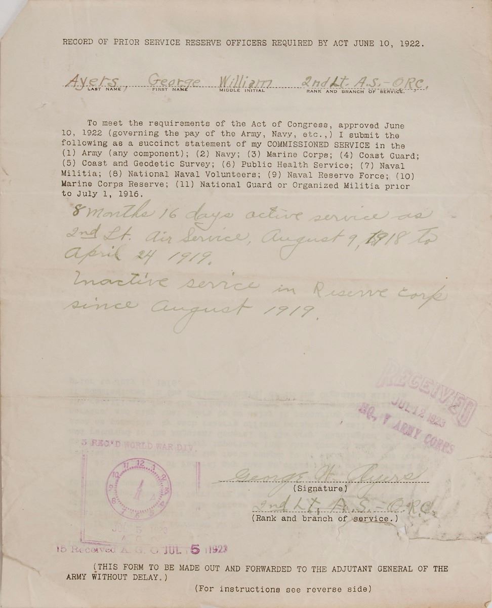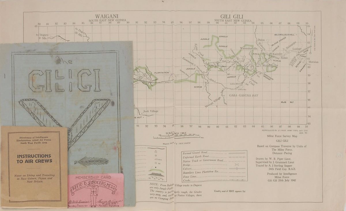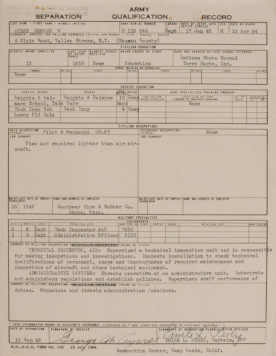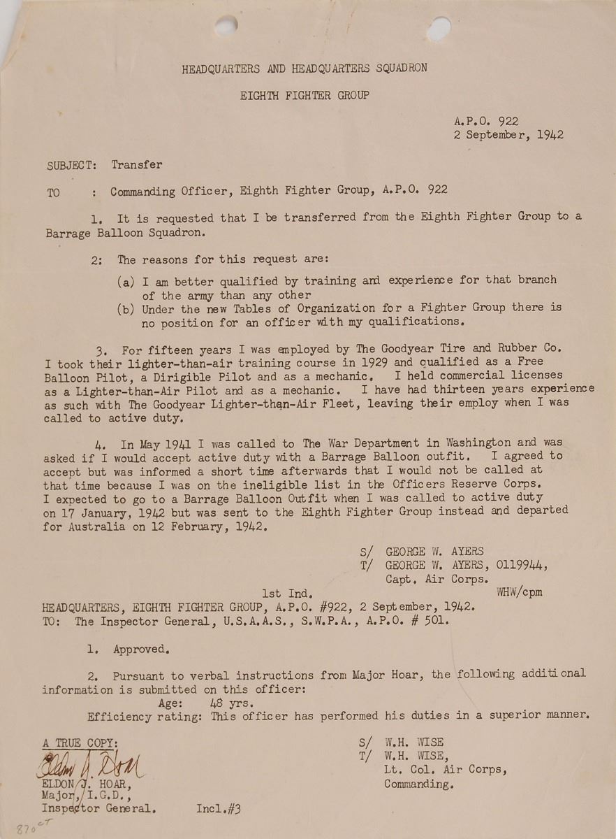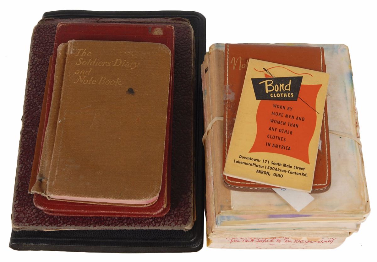 Comprehensive archive from the career of early American aviator George W. Ayers, whose flying career began in World War I and continued through World War II, consisting of a wide variety of material including his papers, equipment, photographs, and other memorabilia. Particularly notable are two leatherbound licenses from the Federation Aeronautique Internationale/National Aeronautic Association of USA certifying Ayers as a “Spherical Balloon Pilot” and “Dirigible Balloon Pilot,” dated 1930 and 1931, each signed inside by Orville Wright. Two large binders consist primarily of his military records and papers, dating from 1918 through 1945, including hundreds of pages of military orders, memos, and records; among the most interesting items here are materials from New Guinea during WWII, including maps, an “Instructions to Air Crews” booklet detailing how to deal with native populations, and a crude soldier-produced newsletter from November 22, 1942, entitled “The Gili Gili.” Also included are eleven photographs from this period, including photos from the 1920s showing the Air Service Officers Reserve Corps and airfields, as well as an early photo of two Goodyear blimps; six oversized photos are also present, including a two-foot-long panorama of a flying regiment and several others showing military aircraft. Numerous flight logs and diaries are included as well. Several elements of Ayers’s uniform are also in this collection, including two types of hats, canvas and leather gaiters, patches, cufflinks, aviator wings, and his dog tag. Some equipment is also included, such as binoculars, a WWI Ingersoll wristwatch, and bowls and silverware brought home from World War II. In overall very good condition. Boasting a wealth of unique and hard-to-find early aviation material, this is an utterly fascinating collection chronicling the life’s journey of a single aviator.