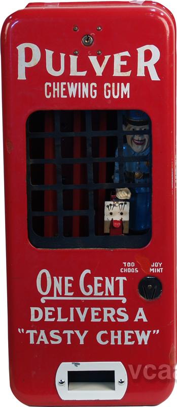 Early Wall Mount 1 Cent Porcelain Short Case Pulver Chewing Gum Vending Machine c1930's, red case w/ cop & robber inside (no glass, as is, needs work)