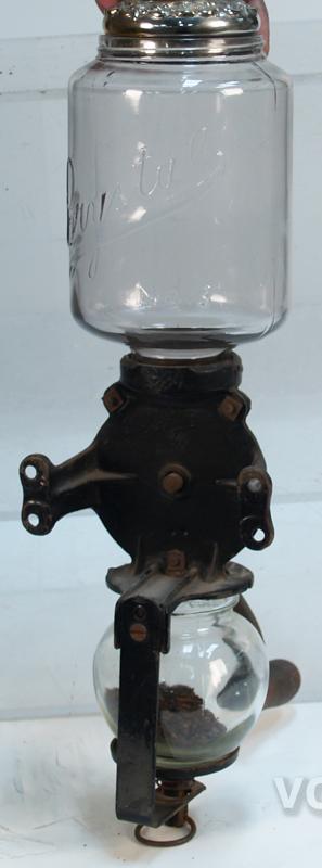 Early Wall Mount Cast-Iron & Embossed Glass Arcade Crystal Coffee Grinder