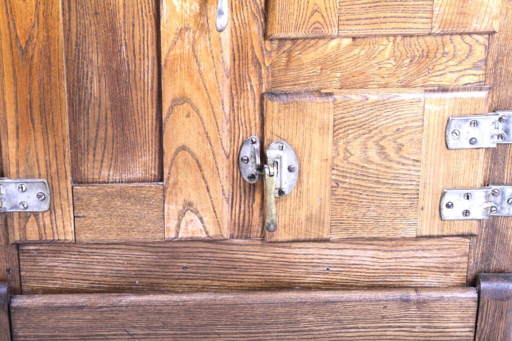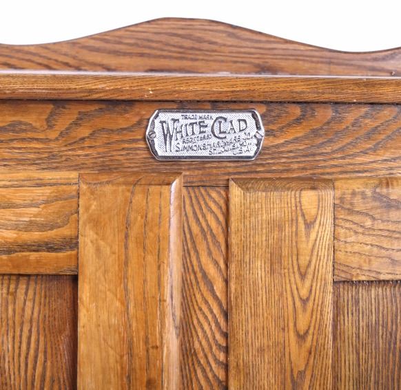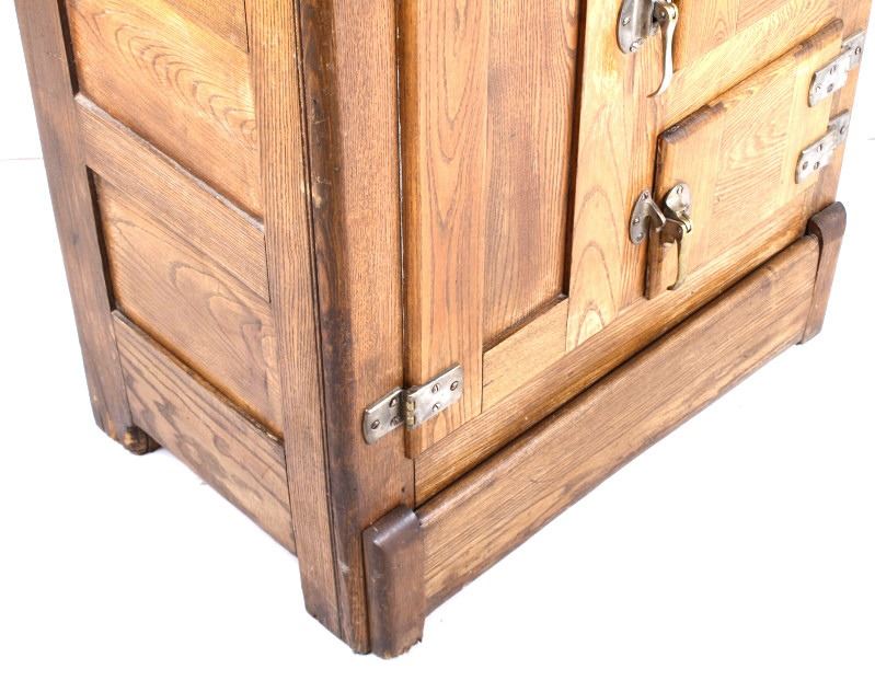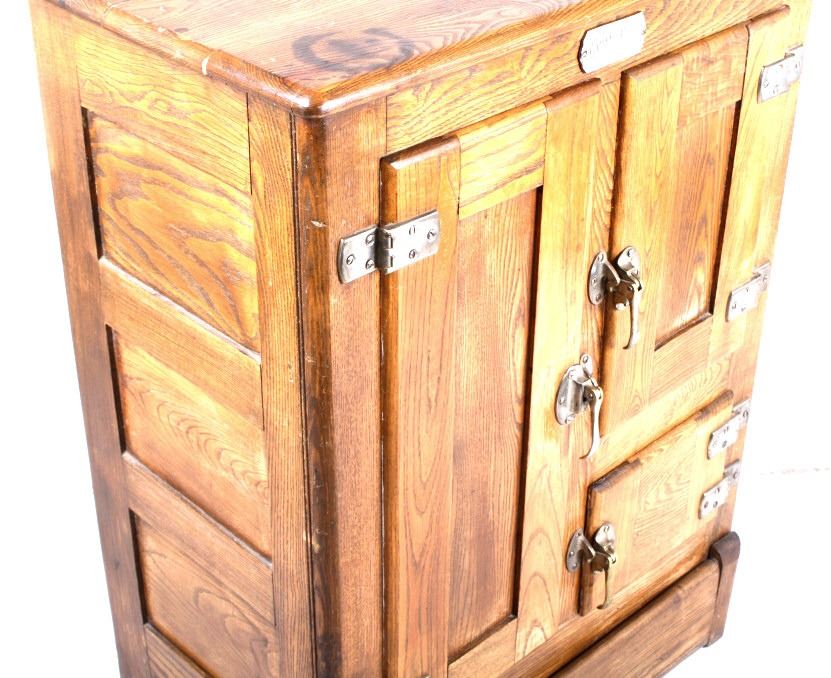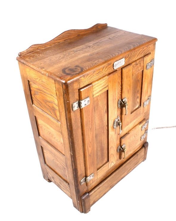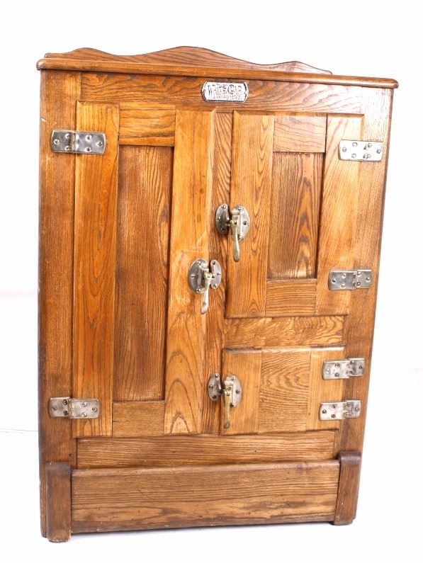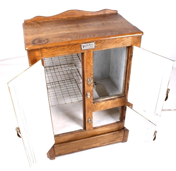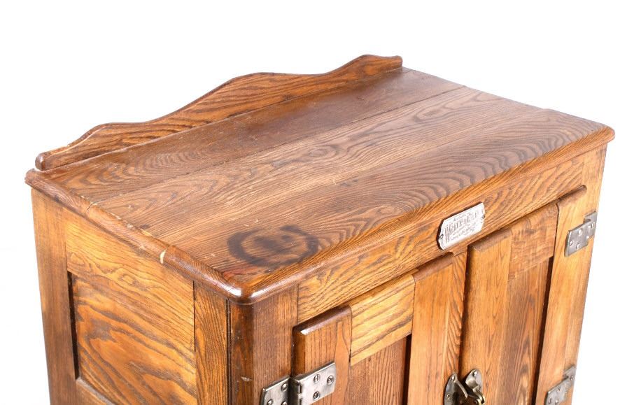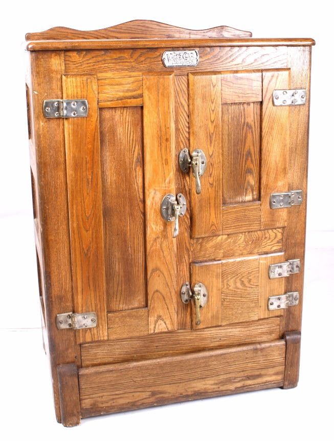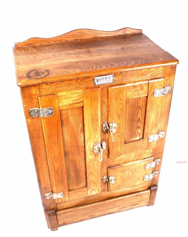 This is an early White Clad Simmons Hardware Co. St. Lois, MO oak Icebox (Ice Box). The piece shows a wonderful panel solid oak wood construction with insulated and metal lined inside. Clad Simmons Hardware was one of the largest icebox producers throughout the 20th century. The Icebox is an excellent representation of such an early and desirable piece. The piece shows wonderful nickel like hardware and the embossed lettering badge along the front. White Clad Iceboxes are an excellent mercantile early piece. Overall good condition. Measures: 38" H x 28" W x 16" D