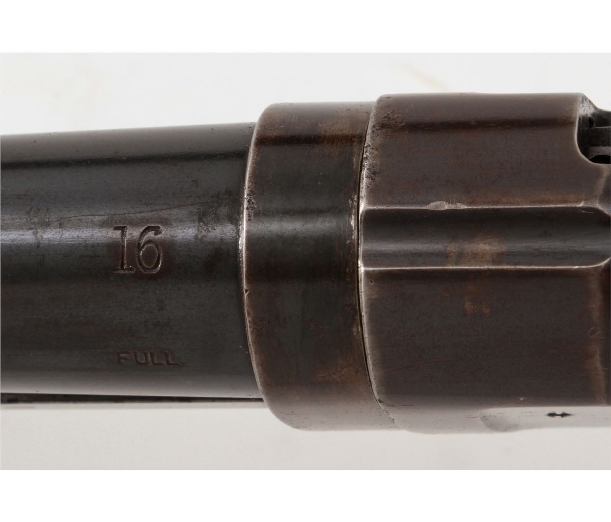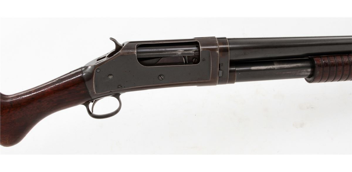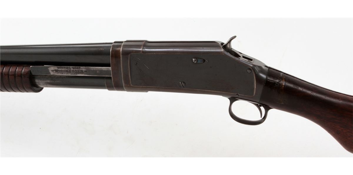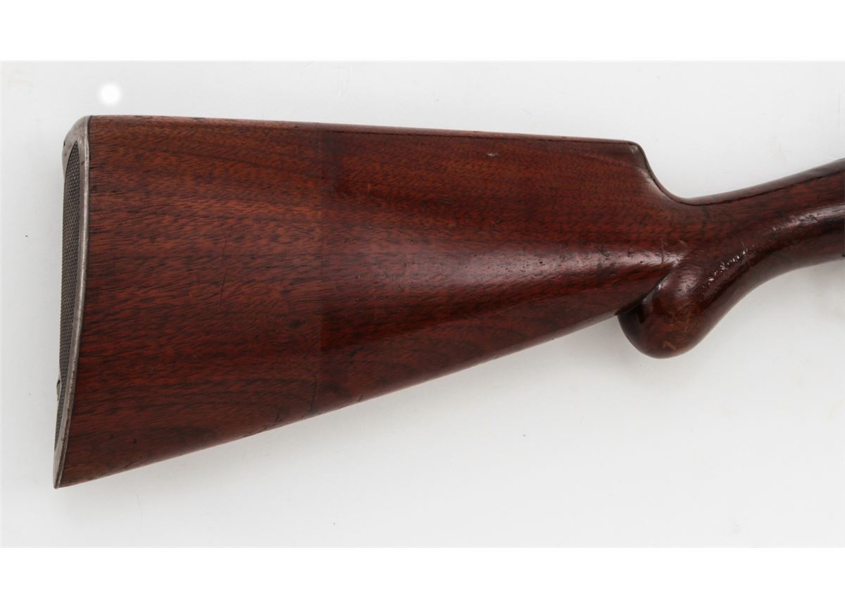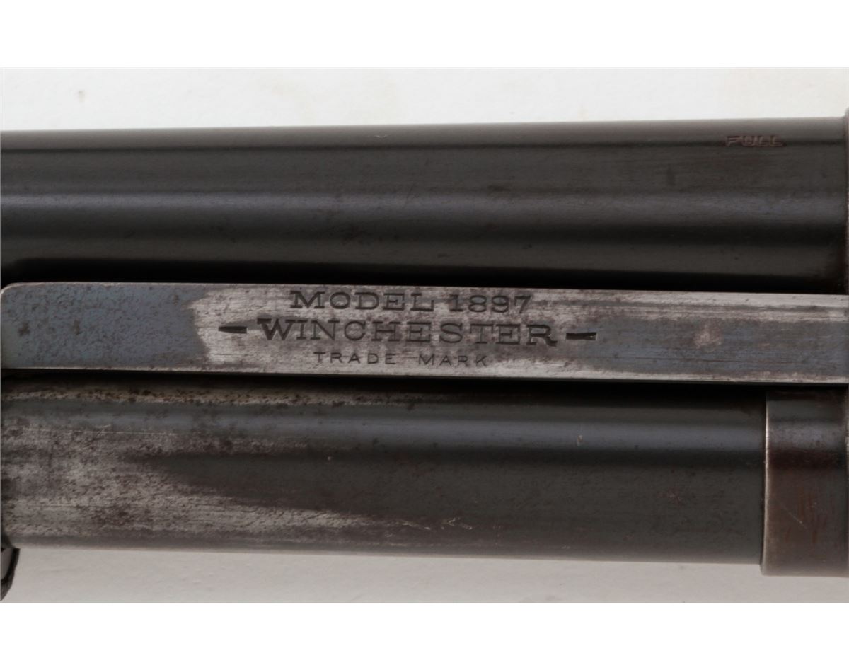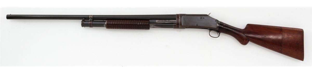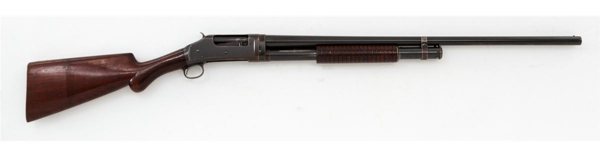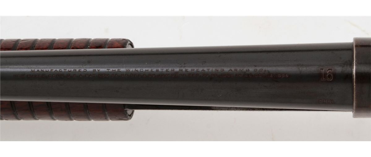 Early Winchester Model 1897 Slide Action Shotgun, #D258599, 16 ga., 2-9/16'', blue finish, 28'' barrel with small front brass bead, Full choke; walnut round knob stock and slide handle, length of pull 13-1/4'' over an original Winchester checkered metal buttplate. Mfg'd 1904. Condition is excellent mechanically with tight action, 90% oxidizing blue on barrels and 50% receiver blue developing a bronze patina. Receiver sides have areas of fine scratching and oxidation spots. Stock has been revarnished over a slip-on recoil pad; a 3/4'' square chip has been replaced at stock head. Est.: $200-$300. (C&R)