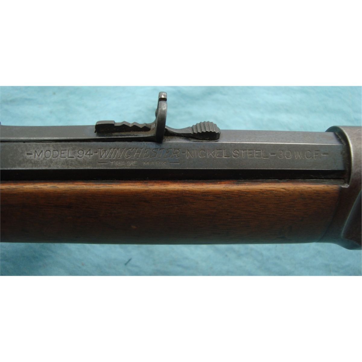 #898244; Mfg. in 1921 w/26" oct. bbl. & bright bore. Bbl. is marked "Model 94 Winchester Nickel Steel 30 WCF". Bbl. retains very good original blue, just starting to wear on the edges. Receiver is brown to grey & action is crisp. Nice wood stock w/minor dents & nicks. Overall a fine early 94 rifle.