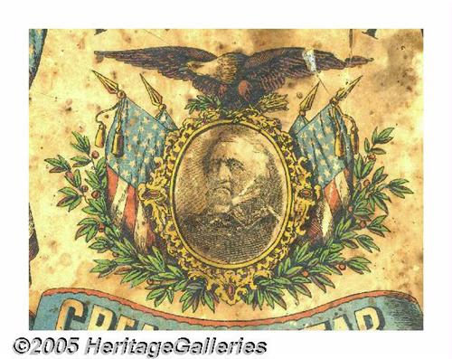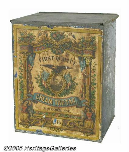 <B>Early Winfield Scott Tin Box</B></I> There are so many items in this sale which we have never seen or offered before that your cataloguer grows tired of repeating the comment, but this item is truly one of the most unusual of the lot! Although "only" of Civil War vintage, it is still a great 3-D item for this very tough candidate. Fairly large tin box with hinged lid (now separated), the front a colorful paper label for "First Quality Cream Tartar," and featuring a nice portrait of Scott with eagle and flags. The label itself is a wonderful example of "period" lithography by H. L. Legien, Gold St., New York, and recorded by J. O. Cooke "in the year 1862." Scott, of course, was still alive and at the end of his illustrious career, serving as supreme commander of the Union Armies. The sides of the box were painted blue (original) and are extensively scratched. The label itself shows overall even "aging," but still has a pleasing, if weathered, display appearance. 7.5" x 6" x 9.5" in height. Lot:256