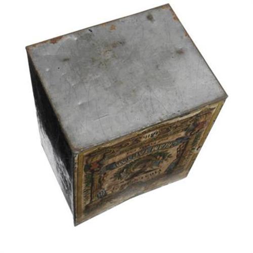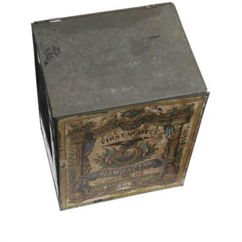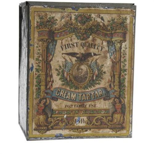 <B>Early Winfield Scott Tin Box</B></I> Although "only" of Civil War vintage, this is still a great 3-D item for this very tough candidate. Fairly large tin box with hinged lid (now separated), the front a colorful paper label for "First Quality Cream Tartar," and featuring a nice portrait of Scott with eagle and flags. The label itself is a wonderful example of "period" lithography by H. L. Legien, Gold St., New York, and recorded by J. O. Cooke "in the year 1862." Scott, of course, was still alive and at the end of his illustrious career, serving as supreme commander of the Union Armies. The sides of the box were painted blue (original) and are extensively scratched. The label itself shows overall even "aging," but still has a pleasing, if weathered, display appearance. 7.5" x 6" x 9.5" in height.<BR><BR><b>Shipping:</b> Hollowware/Pottery/Glass, Small (<a target="_blank" href="http://www.heritageauctions.com/common/shipping.php">view shipping information</a>\)