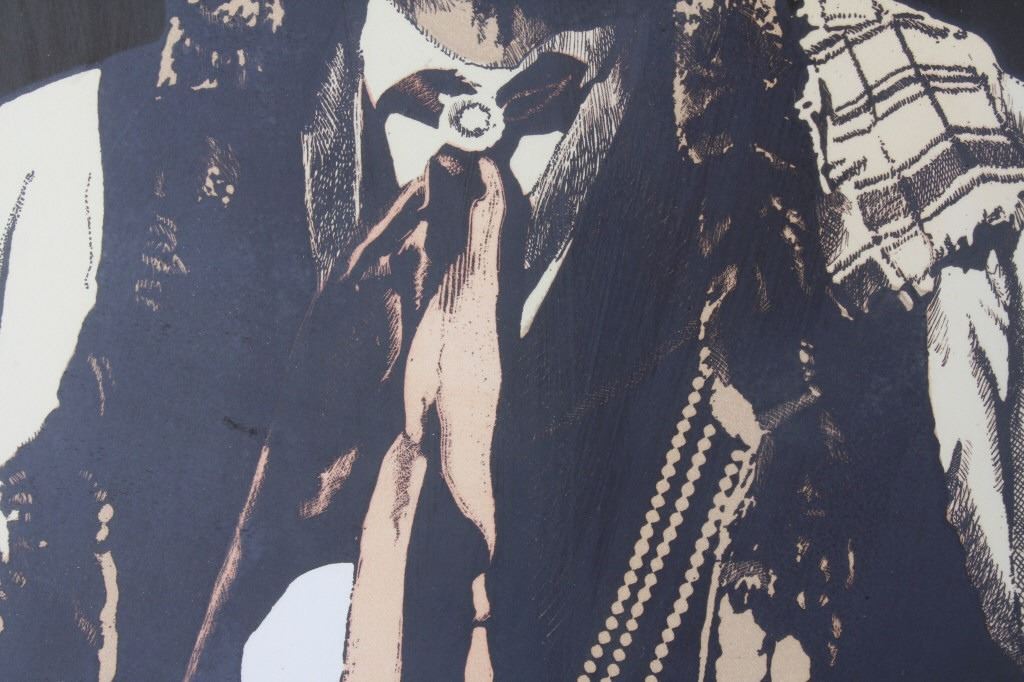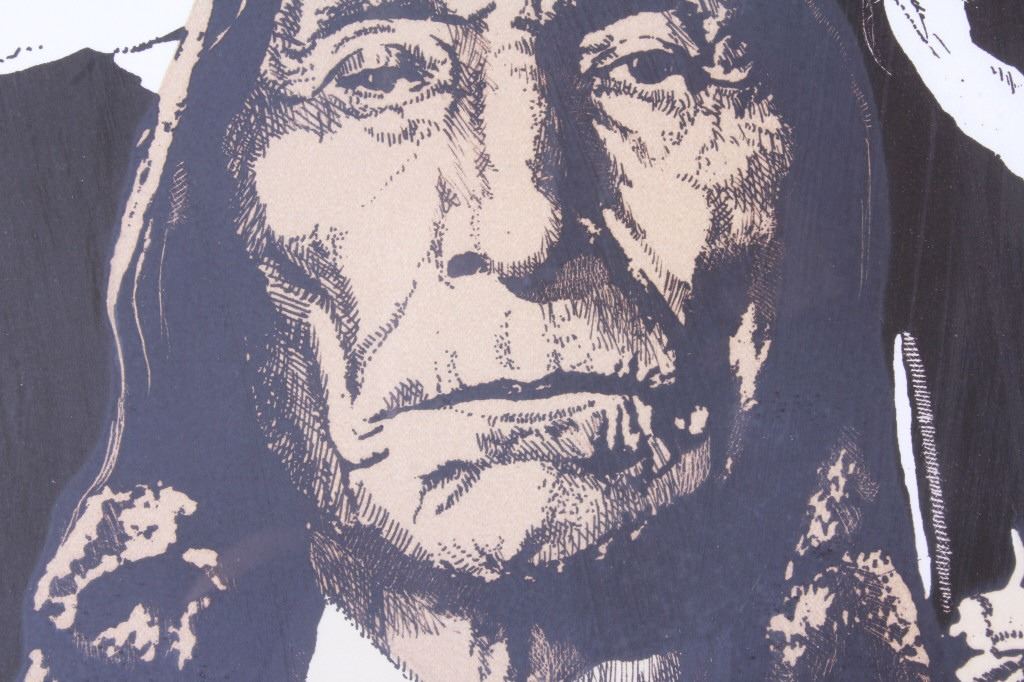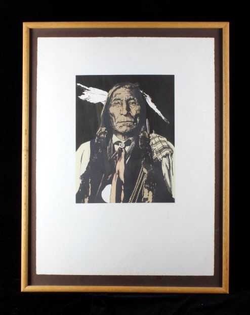This lot includes an exceptional Early Wolf Robe Serigraph Portrait. Serigraphy, a medium that's been around for over one hundred years. Serigraphy is a fancy term for silkscreen printing. The word was coined early in the last century to distinguish the artistic use of the medium from its more common commercial purpose. Silkscreening, as we know it, however, dates only to the early years of the 20th century. This piece shows great detail of Wolf Robe or Ho'néhevotoomáhe (born between 1838 and 1841). Wolf Robe was a Southern Cheyenne chief and a holder of the Benjamin Harrison Peace Medal. During the late 1870s he was forced to leave the open plains and relocate his tribe on to the Cheyenne and Arapaho Indian Reservation in Indian Territory. Provenance: From the renowned Sundog Fine Art Bozeman, Montana collection and collected by Bruce VanLandingham. Bruce VanLandingham was a pillar in the American Indian collecting community and a respected expert. Along with being an avid collector Bruce also was the sole owner of Sundog Fine Art Gallery in Bozeman which was both part museum and gallery. This excellent piece shows wonderful quality and detail. The frame measures 25 1/2" by 33 1/2". The artwork shows 12 1/4" by 16".