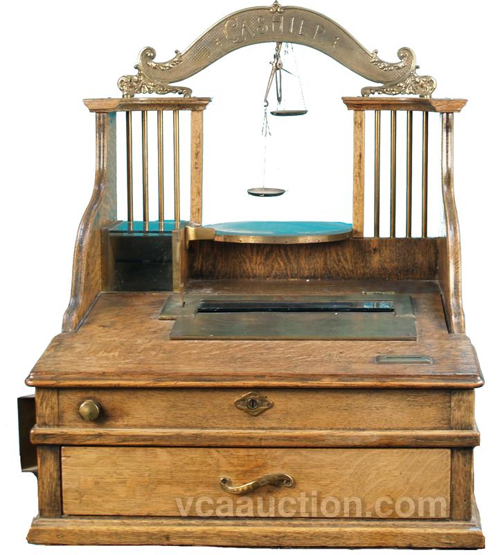 Early Wooden & Brass Gold Scale Cash Register by Cashier Cash Register Co. Made In Los Angeles, California, USA. all original w/ scale