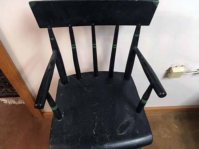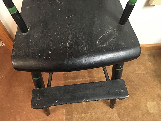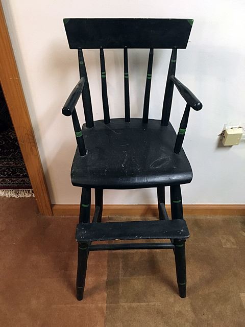 Nice, early wooden high chair, painted black with decorative green stripe accents.