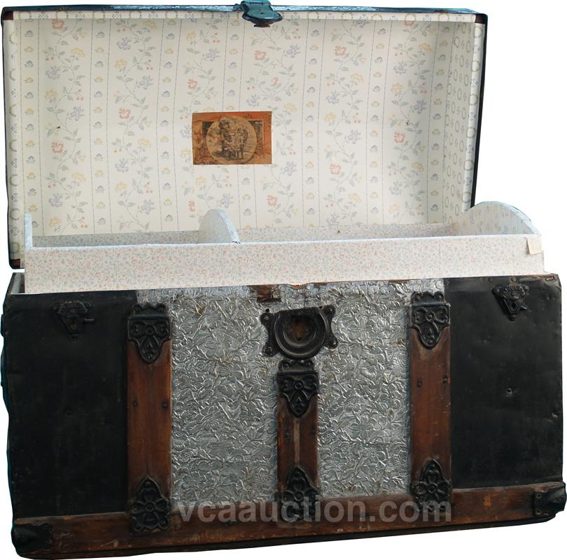 Early Wooden & Metal Trunk w/ original victorian girl & doll decal inside lid - 28" x 15" x 19"