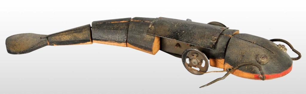 American. Working. Extremely unusual and rare. When wound, catfish wiggles as it moves forward while two tin wheels on side guide it. Patent on bottom with original spring whiskers. Condition (Very Good - Excellent). Size 10" L.