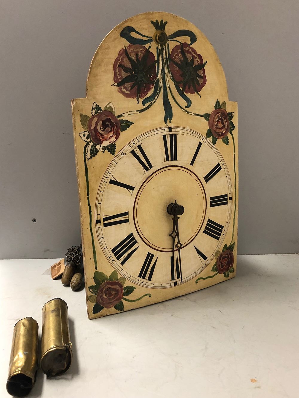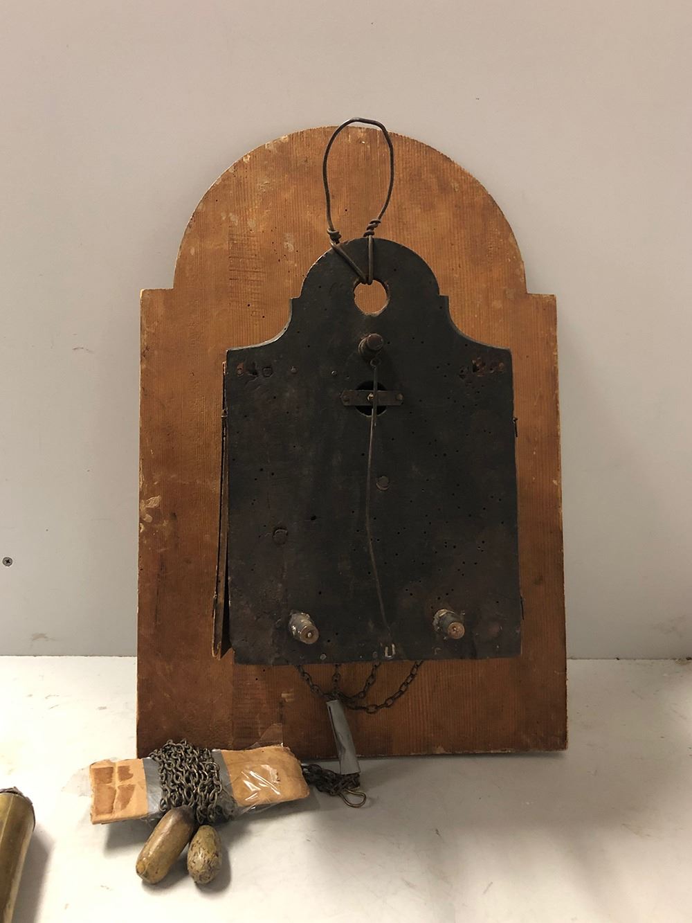 Early wooden wag on the wall clock, original brass weights, nice pairing on dial.