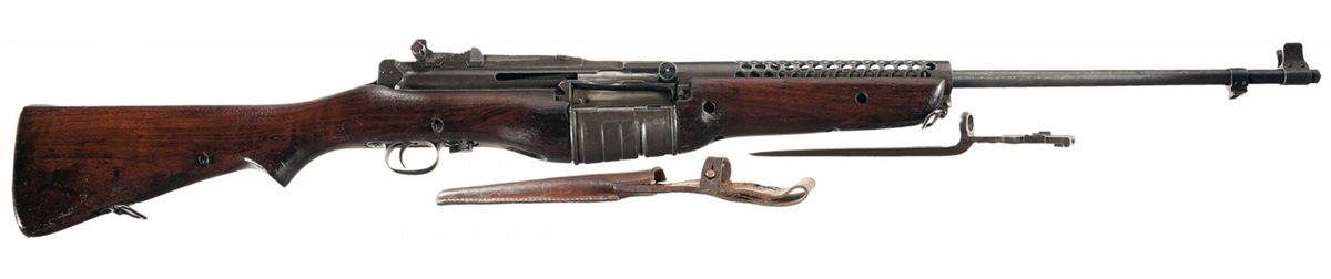 This is a solid example of a early Model 1941 Johnson Semi-Automatic Rifle as manufactured by the Cranston Arms Company. Subsequent to the fall of the Dutch East Indies to Japan in 1942, some of the Dutch contract rifles that were not shipped overseas were obtained by the Marine Corps and issued to the Marine Parachute and Raider Battalions for use in the South Pacific island hopping campaign in 1943. These rifles have several unique features such as a 10 round rotary magazine, a recoiling barrel which started the cycling of the rifle and a takedown feature that allowed the barrel to be easily removed and stored in a parachute jump bag for the Para Marines, a two-piece walnut stock, and a one piece cast receiver with a perforated front section that acts as a barrel heat shield. The top of the receiver has the Johnson patent numbers followed by "CAL. 30-06-SEMI-AUTO/"JOHNSON AUTOMATICS"/MODEL OF 1941/MADE IN PROVIDENCE, R.I., U.S.A." over the serial number with no letter prefix. The right rear receiver side has a five-pointed star above "CRANSTON/ARMS/CO." in an inverted triangle. The tangent rear sight is correctly graduated in meters. The barrel is marked ".30-06/41" on the front face of the collar and "J.A./30-06" on the rear of the barrel over the chamber. With an original Johnson bayonet with original leather scabbard that is stamped "8796" and the bayonet ring is stamped "2635".