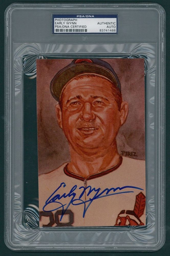 Photo measures 5" x 7" in size and has been hand-signed in blue felt-tip pen by Early Wynn (D 1999, Indians HOF). Autograph has been encapsulated by PSA/DNA for authenticity purposes