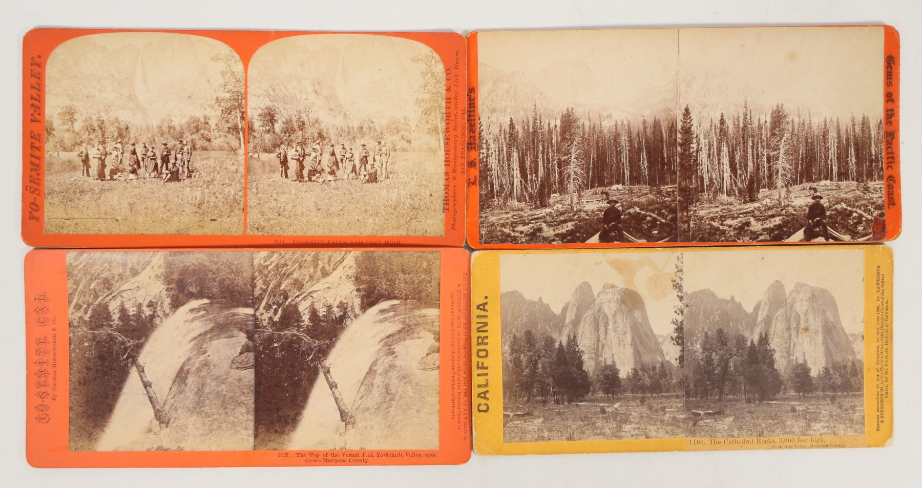 Lot of 4 different. 1) Intriguing Thomas Houseworth & Co. view (c.1874-86) of a group of people with Yosemite Falls in the background. The man fourth from the left sure bears a striking resemblance to author and naturalist John Muir, who was active in Yosemite during this period. But we cannot confirm. 2) 1866 Lawrence & Houseworth view of Cathedral Rocks. 3) LS Hazeltine view of man with granite peaks in the background. Possibly Chinese? 4) Different style 1866 Thomas Houseworth & Co. of the top of Vernal Falls.