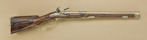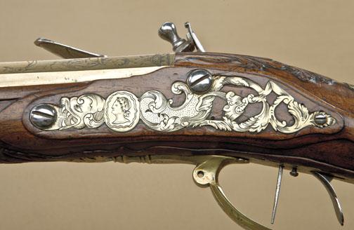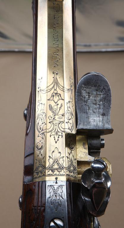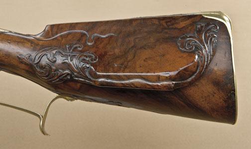 Early and high quality German flintlock Jaeger rifle signed “M. Gerlach” on lock, and “A. Franckfurt” on barrel. This unusual Jaeger shows an octagon brass barrel, brass lockplate with brass mounts, all of which are finely engraved and show traces of thin gold gilt. The gun is richly stocked in root burl with fine raised carving and moulding around the mounts. The cheekpiece shows fancy intertwining floral scrolls. The metalsurfaces are in very good plus to near fine condition with sharp engraving and good edges. The rifle is in its original flintlock configuration and shows early styling which we would date this Jaeger from 1720 to 1750.The stock shows very sharp carving and edges and just some small old repairs which are perfectly accomplished. The rifle measures 37-3/4” overall with 25” barrel of approx. .52 caliber (rifled). The nicest early Jaeger we have seen on the market in a long while. Provenance: Charles Edwin Moses collection, Ashtabula, Ohio. Est: $10,000 - $20,000