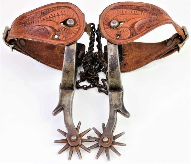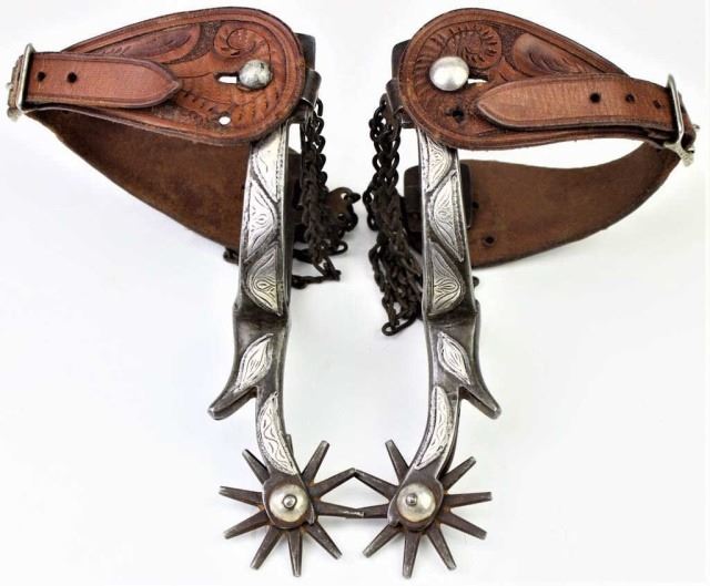 Early c.1890s California spurssingle mounted inlayed silver, chap guard shanks, heel chains, 2" 10 point rowels and inner leather straps, spurs show fine overall condition with NO loss or repairs. Est. 500-750