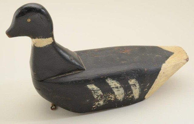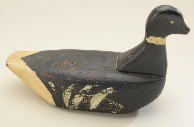 Early carved wood decoy approx. 11” in height by 16” long by nearly 6” wide, neck and body in two pieces, lead weighted on belly; old metal fixture still attached, no signature, some chips and use, wear, about 50% paint;appears American. From the estate of Robert Petersen. Est.: $100-$300.