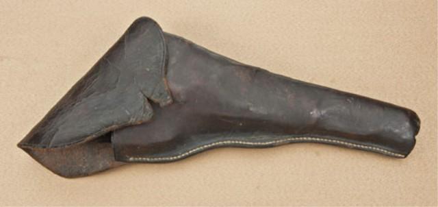 Early commercial flap holster for Colt Dragoon with 7-1/2” or 8” barrel, heavily reinforced scene, belt loop with brass rivet, well made, fair to good condition. Flap shows some folding and small losses and the fastener is missing. The holster shows no makers, some slight losses, has reinforced stitching for heavy dragoon and is absolutely authentic. Est: $400 - $800