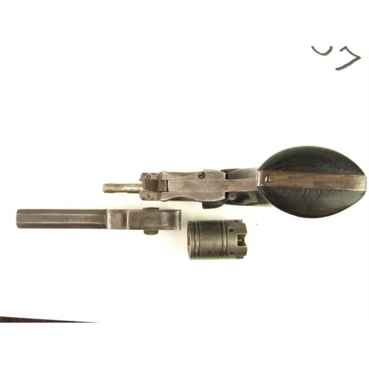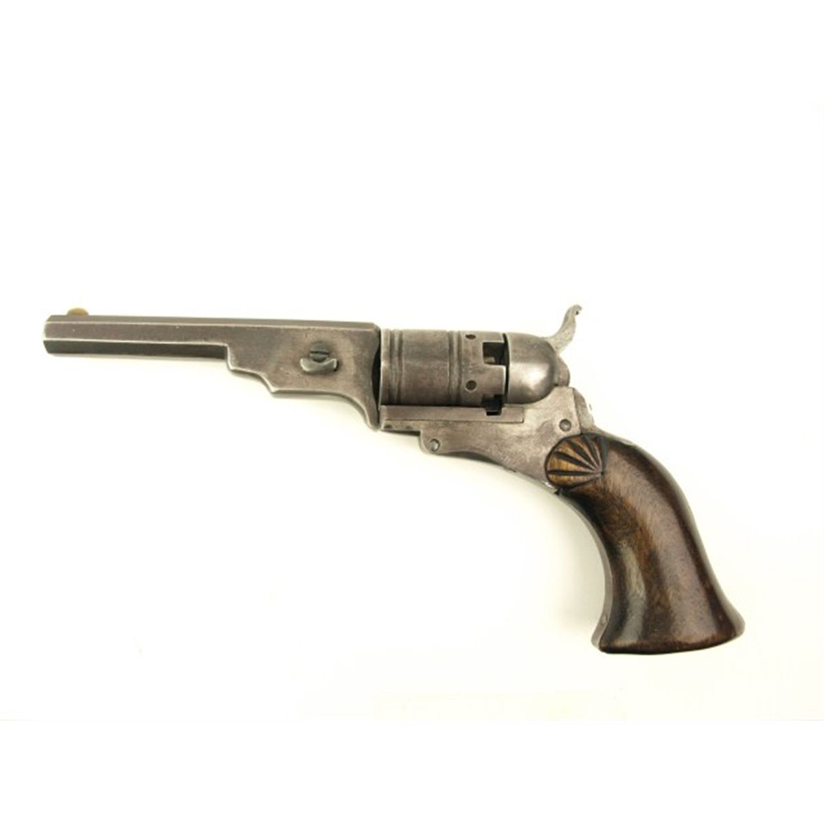 Early copy of Colt Patterson belt pistol the only markings "Pat. Arms Mg. Co. Patterson NJ-Colts PT" to top of barrel. Barrel 5" with nickel silver blade front sight, .31 cal. and fitted with walnut grips. Revolver displays natural silver gray turning brown patina, functioning tight action. Only known history to the copy is purchased many years ago from elderly couple at Baltimore gun show. NO FFL.
