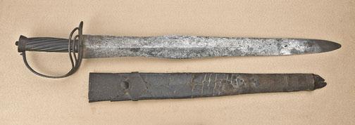 Early cutlass, probably American, measuring 27-1/2” overall with 22-1/2” flared blade, iron guard, simple turned and carved wood grip with original iron mounted leather scabbard. The blade and hilt show anuncleaned patina with light to slightly heavy erosion and pinprick pitting. The grip is good, the scabbard fair to good with some cracking, missing its tip, losses at the edges, and normal deterioration. The bladeshows an uncommon flare or widening of the blade, approx. 7” from the hilt which extends approx. 3-4” down the blade before narrowing back. The blade measures 2” at the hilt, approx. 2-1/4” at the widest part of theflare. A completely unique style of sword which we would date to the Revolutionary War era and we believe is American but we can find no other example illustrated. Should be interesting to further research. Est: $1,500-3000