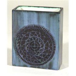 Early flat sided Troika pottery vase with black stylised decoration onto a blue ground, printed mark to base,13cm high