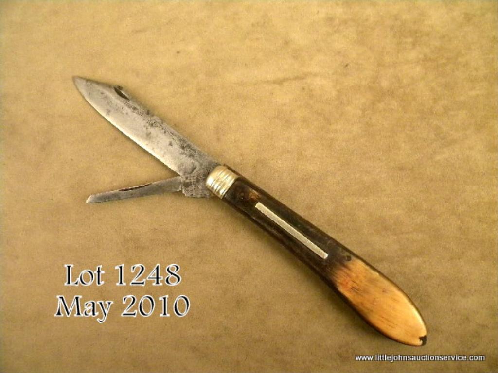 Early folding pocket knife with unusual marking on main blade. Imperial Chinese-American hunting knife by Villon's Sheffield. The knife measures 5" when folded, shows cow horn grip scales, main blade now 3-7/8", originally about 4-1/2" and hasbeen shortened and polished. Small blade now 2-3/8", originally approx. 2-3/4". Fair condition, showing wear and use. Est: $150 - $300