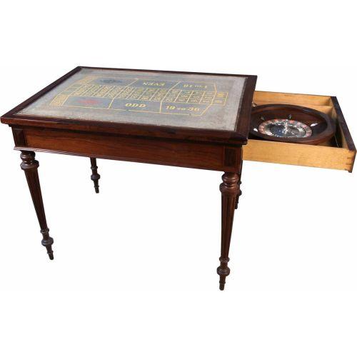 Early game table with felt Roulette layout on top 27"x35" 28" tall has 14 12" Diam Wheel.