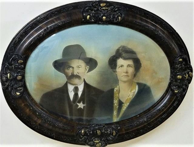 Early hand tinted portrait of an early old westlawman and his wife in original oval frame, image unidentified, 18" X 25". Est. 250-500