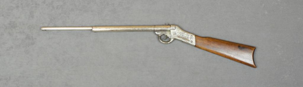Early metal and wood Daisy BB gun, approx. 29-1/2” overall and in good condition showing approx. 90% original nickel, very good wood with scattered mars and scratches from storage; front barrel insert missing; charges by tipping the barrel down. Est.: $30-$60.