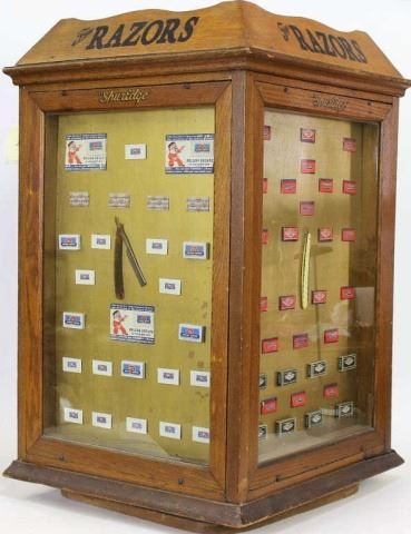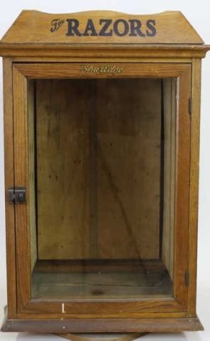 Early oak Shuredge Mercantile display caseon rotating base for mens razors, 3 sided glass display with rear door for product storage, case is in original finish including graphics, with sample products intact showing excellent condition, 22" X 22" X 35". Est. 600-1200