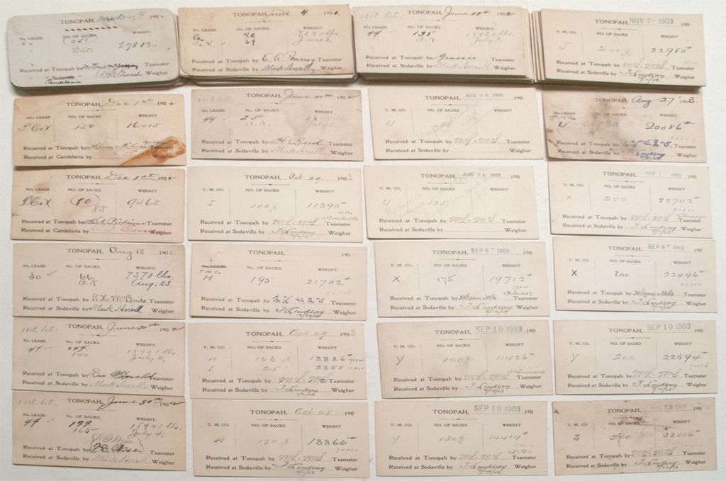 Over 75 ore receipts from Sodaville and Canelaria. One from McLean & McSweeney teamsters. Another delivered by McBride. Alos Bard, Pomeroy, Lathrup, etc. From 2 sacks to 150 sacks. All 1902 and 1903.City: TonopahCounty: NyeState: NV