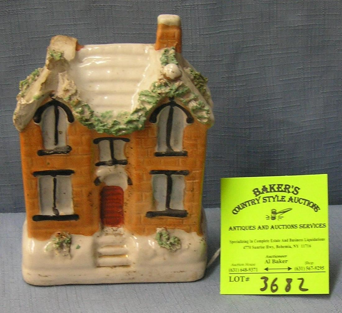 Early painted porcelain building bank condition as found est. value $50.00-$75.00