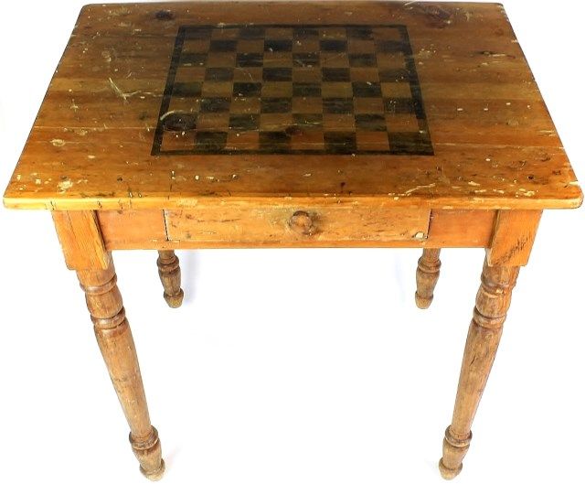turned legs with painted game board top, 23" X 29" X 30". Table purportedly from cavalry Ft. Robinson in Nebraska. Terrific pine piece in good solid condition. Est. 250-450
