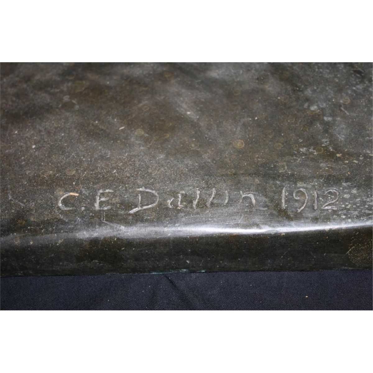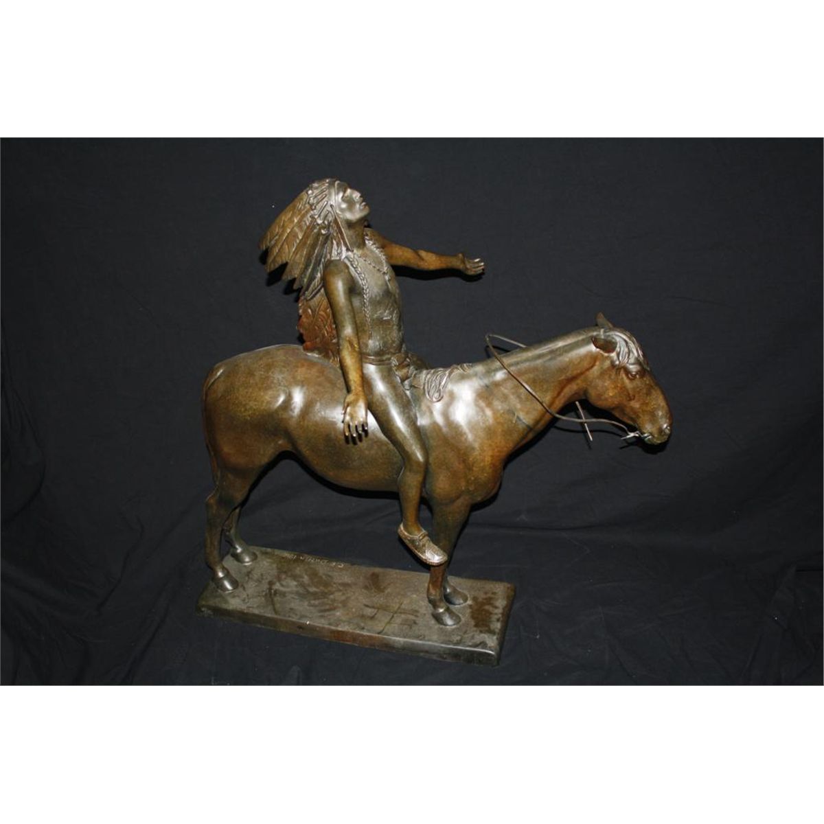 Early posthumous casting of American Indian  on horseback entitled Addressing the Great  Spirit, original by Cyrus Dallin. Approx. 41”  in height, showing age and good patina. This  piece was acquired by Petersen Galleries inthe 1960’s and could go back as far as the  1930’s or 40’s. Signed in casting “C. E.  Dallin 1912” and numbered “10/75” in casting.  We have had it examined very closely and  measured by Western art experts, of whichseveral agree it is an early and fine copy  that is hard to detect from the original.  From the Robert Petersen Collection. Est:  $5,000- $10,000