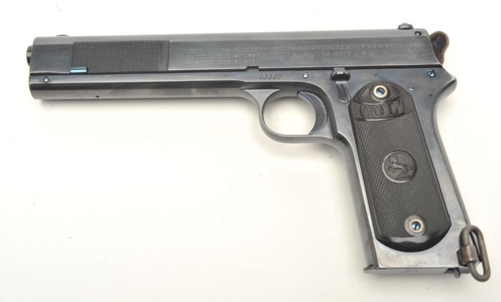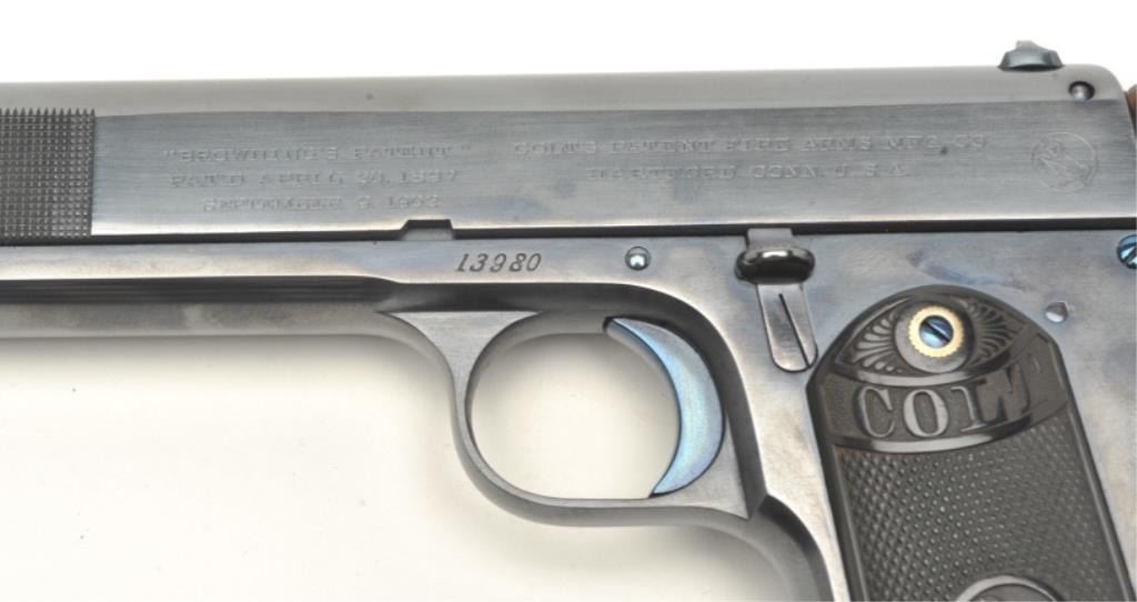 .38 caliber, 6” barrel, blued finish, slide serrations at front section, checkered black hard rubber grips, S/N 13980, high quality restoration (possibly by Turnbull), looks original and minty. (C&R/PPT). Est.: $2,000-$4,000.