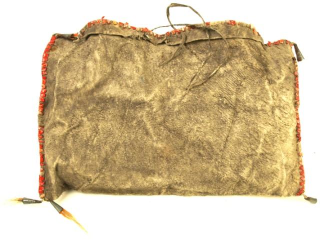 Early quilled small Plains possible style bag leather somewhat stiff with cone dangle at corner and quilled edges. Measures 6" X 10".